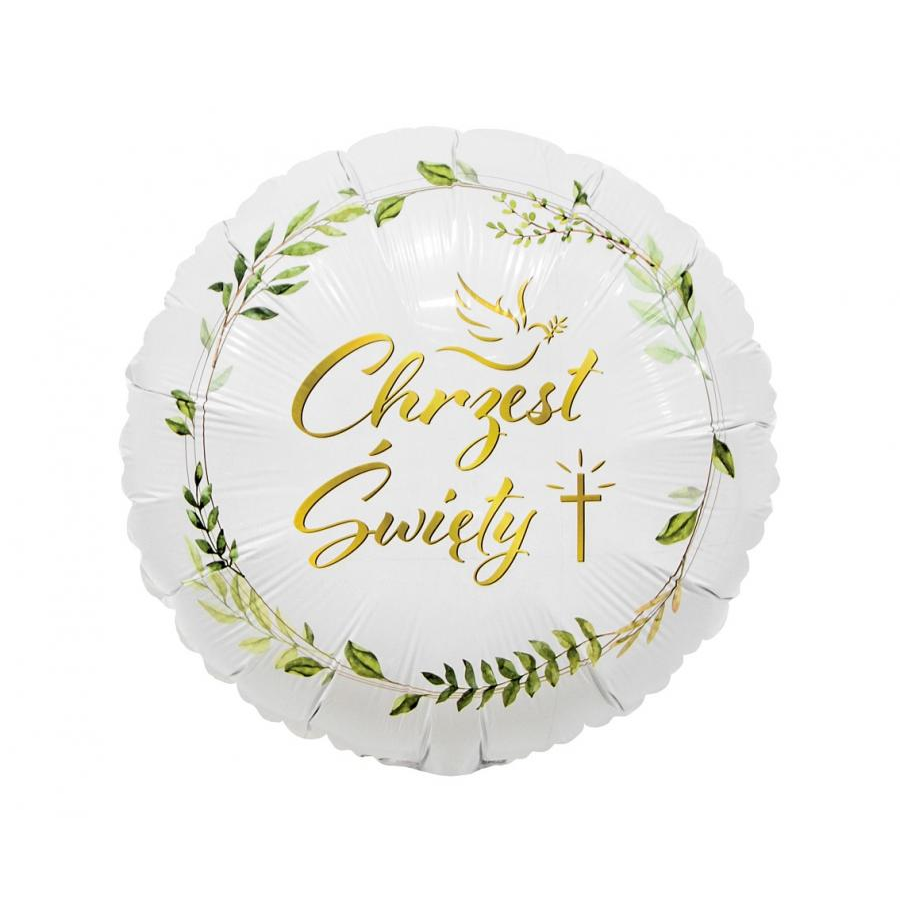 Okrągły balon foliowy w kolorze białym, ozdobiony zielonymi listkami, złotym gołąbkiem oraz napisem Chrzest Święty sprawdzi się doskonale jako elegancka i delikatna dekoracja urodzinowa!