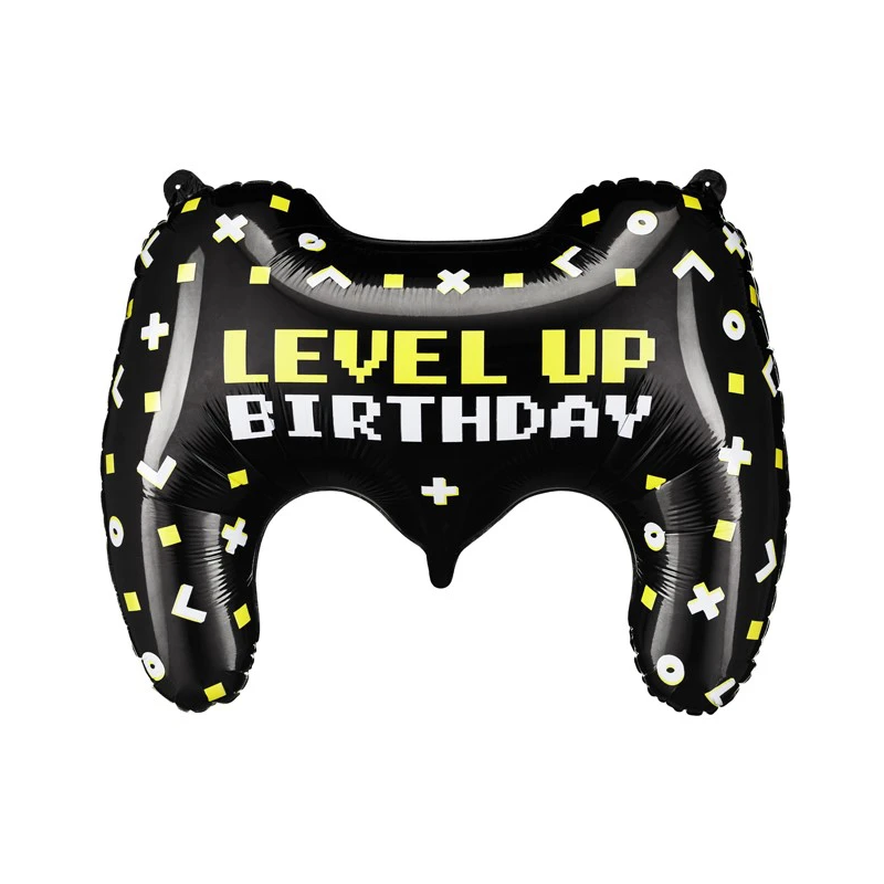 Czarny balon foliowy w kształcie gamepada, ozdobiony napisem "Level Up Birthday" sprawdzi się doskonale jako idealna dekoracja urodzinowa dla każdego zapalonego gracza!