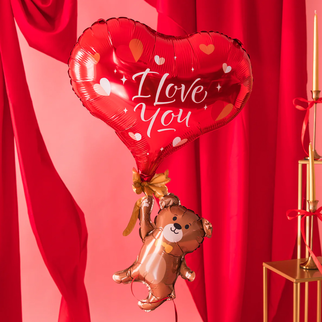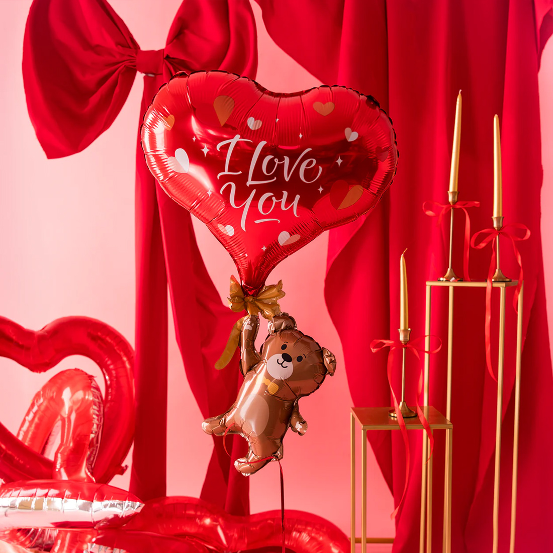 Brązowy balon foliowy w kształcie uśmiechniętego misia odlatującego na balonie w kształcie serca z napisem "I love you" sprawdzi się doskonale jako dekoracja na walentynki, urodziny i wiele innych okazji!