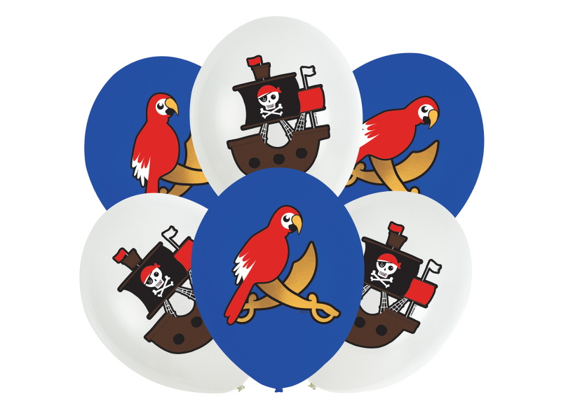 Balony gumowe w kolorach białym i niebieskim ozdobiony nadrukiem pirackiego statku oraz papugi siedzącej na skrzyżowanych szbalach to doskonała ozdoba, na wiele okazji!