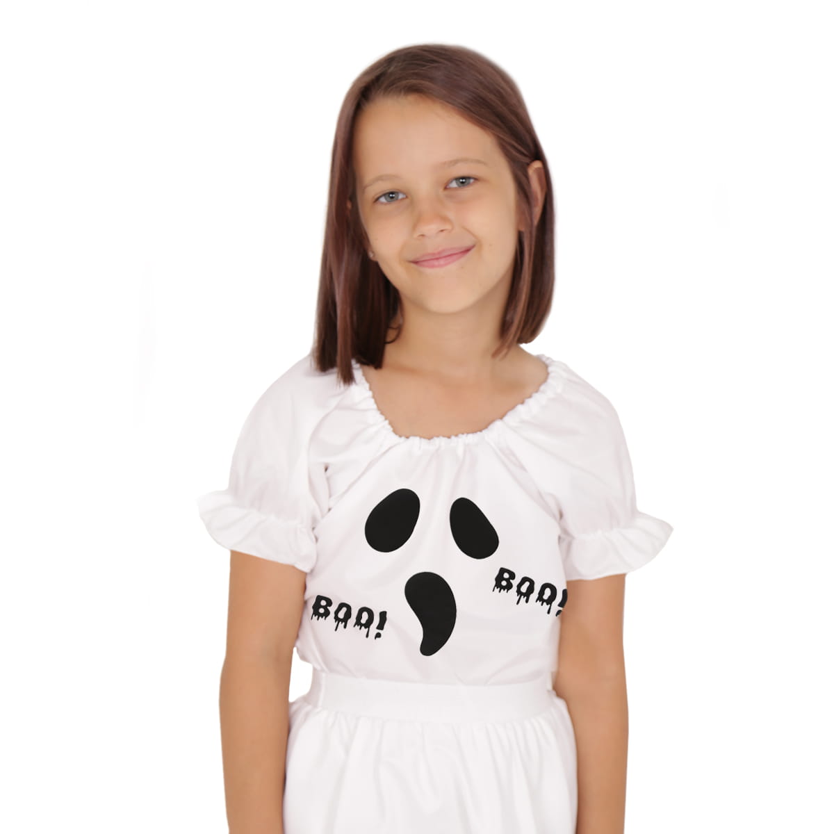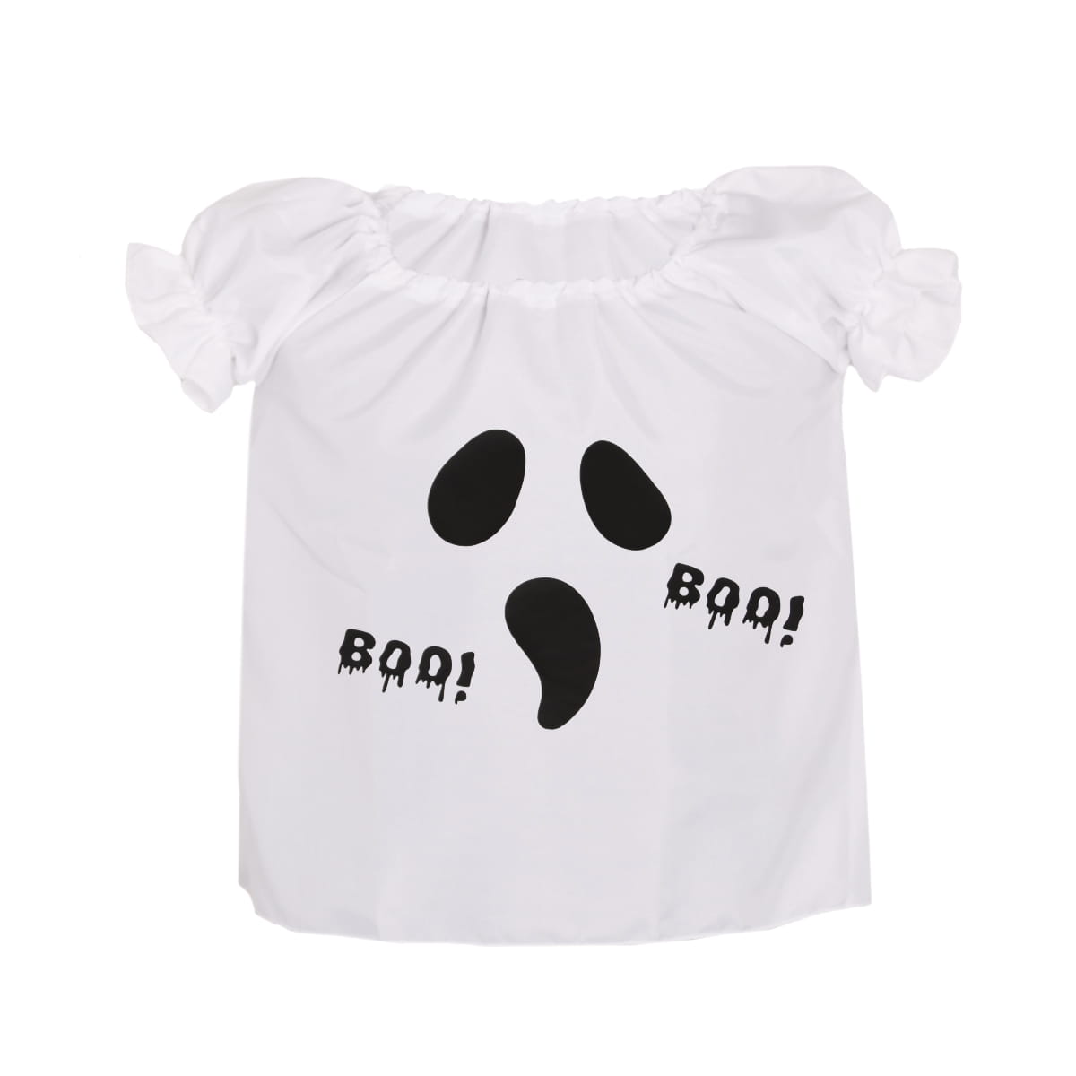 Oto biała bluzeczka wykonana z lekkiego materiału pongee, która wyróżnia się czarnym, minimalistycznym twarzy ducha wraz z napisem "Booo!". Bluzeczka świetnie się nadaje jako dodatek do stroju duszka, dzięki któremu Twój Maluszek zabłyśnie na każdym Halloween, Balu Przebierańców i przy wielu innych okazjach!