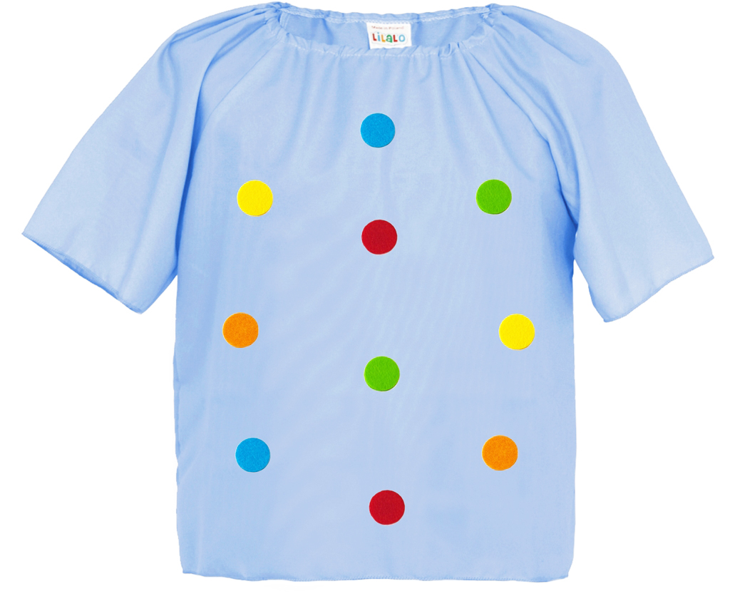 Oto błękitna bluzeczka wykonana z lekkiego materiału pongee, która wyróżnia się kolorowymi filcowymi groszkami rozsianymi po całej przedniej stronie bluzeczki! Dzięki temu bluzka świetnie się nadaje jako dodatek do stroju kropki, klauna lub wielu innych przebrań, dzięki któremu Twój Maluszek zabłyśnie na każdym przyjęciu!