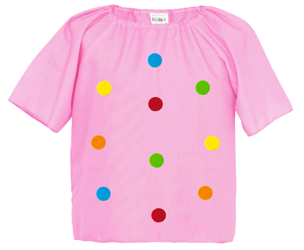 Oto różowa bluzeczka wykonana z lekkiego materiału pongee, która wyróżnia się kolorowymi filcowymi groszkami rozsianymi po całej przedniej stronie bluzeczki! Dzięki temu bluzka świetnie się nadaje jako dodatek do stroju kropki, klauna lub wielu innych przebrań, dzięki któremu Twój Maluszek zabłyśnie na każdym przyjęciu!