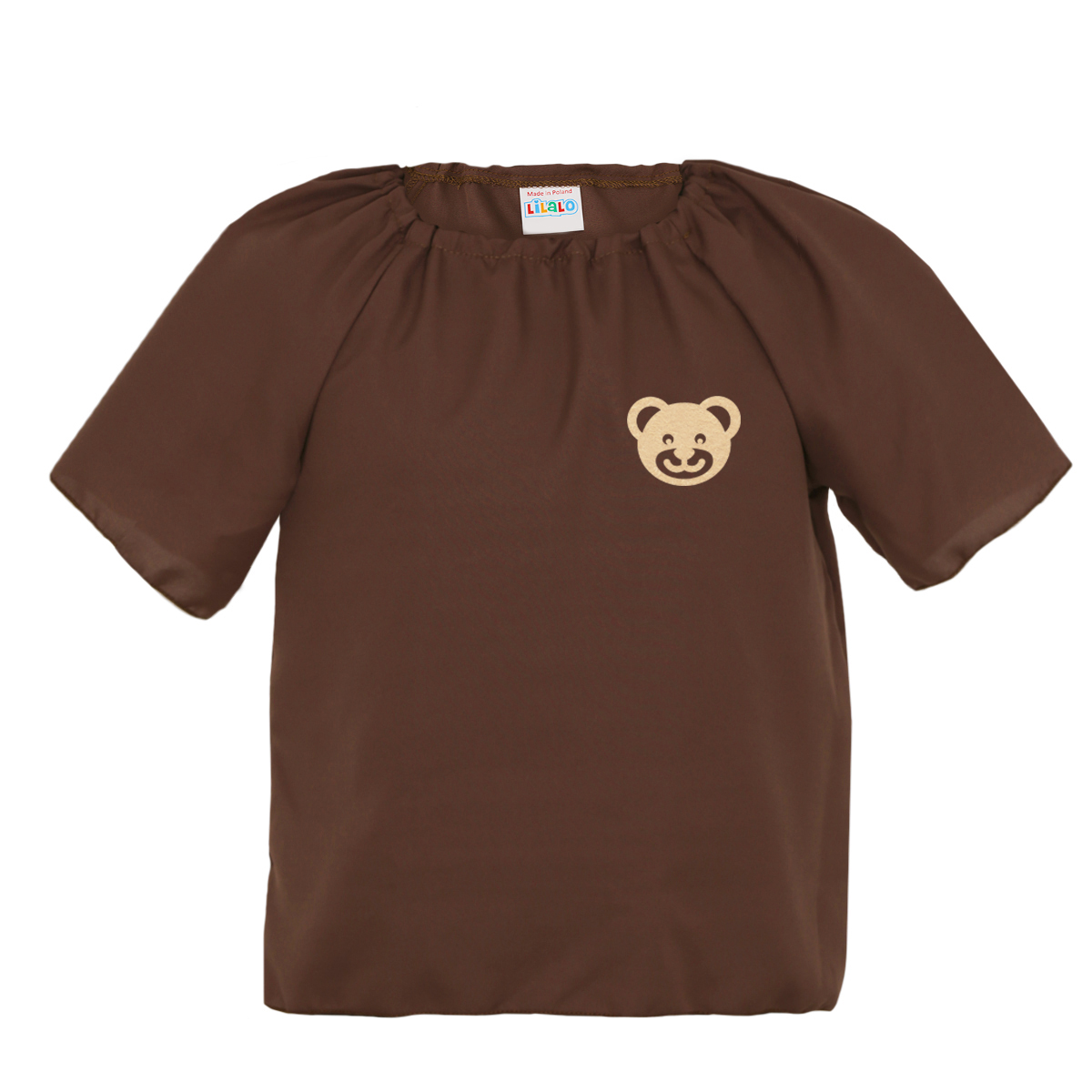 Oto brązowa bluzeczka wykonana z lekkiego materiału pongee, która wyróżnia się beżowym filcowym misiem! Dzięki temu koszulka świetnie się nadaje jako dodatek do stroju uroczego niedźwiadka lub wielu innych przebrań, dzięki któremu Twój Maluszek zabłyśnie na każdym przyjęciu!
