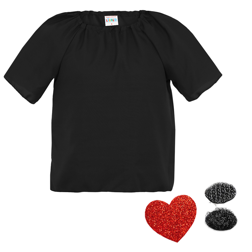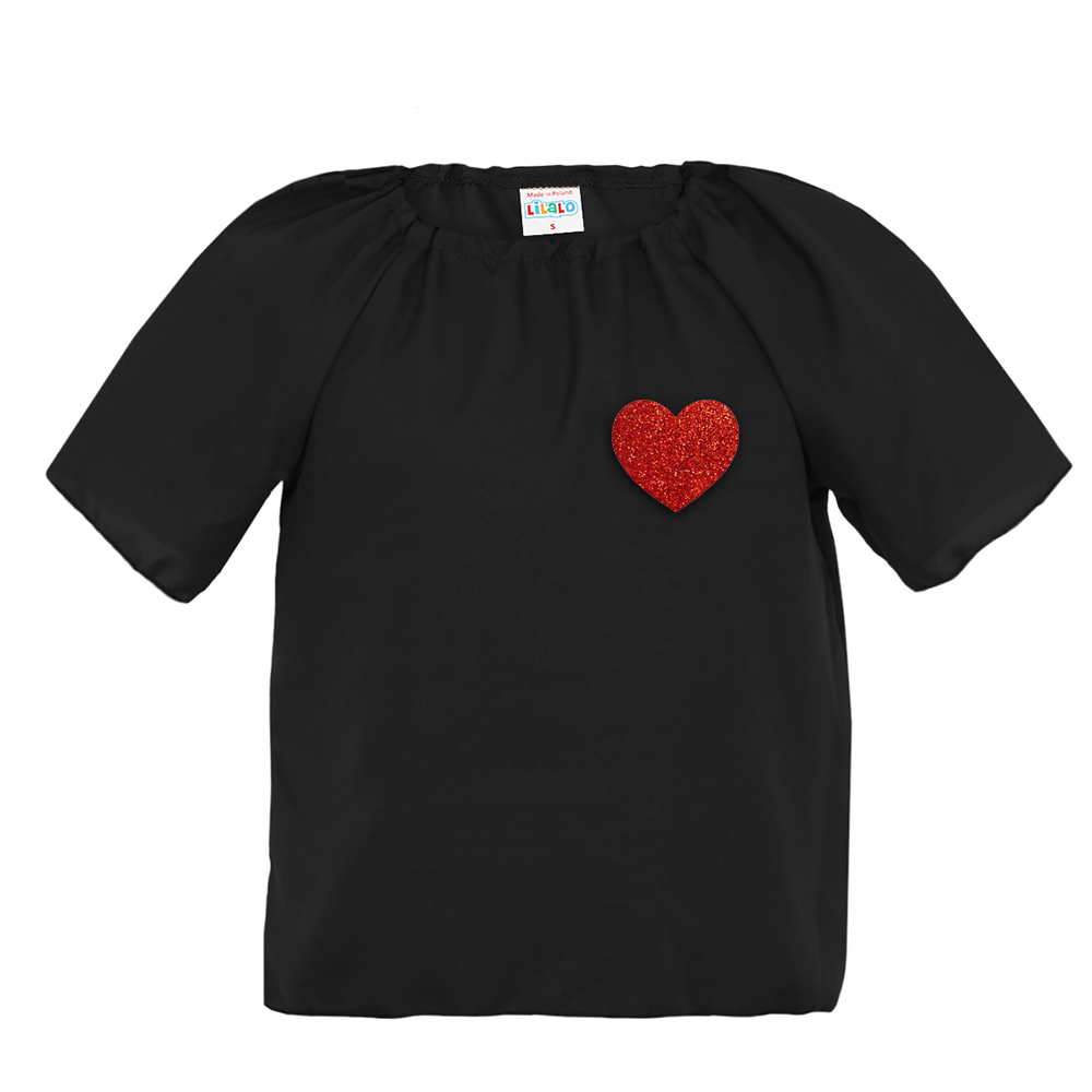 Oto czarna bluzeczka wykonana z lekkiego materiału pongee, która wyróżnia się czerwonym, brokatowym serduszkiem Dzięki temu koszulka świetnie się nadaje jako dodatek do stroju Amora lub wielu innych przebrań, dzięki któremu Twój Maluszek zabłyśnie na każdym przyjęciu!