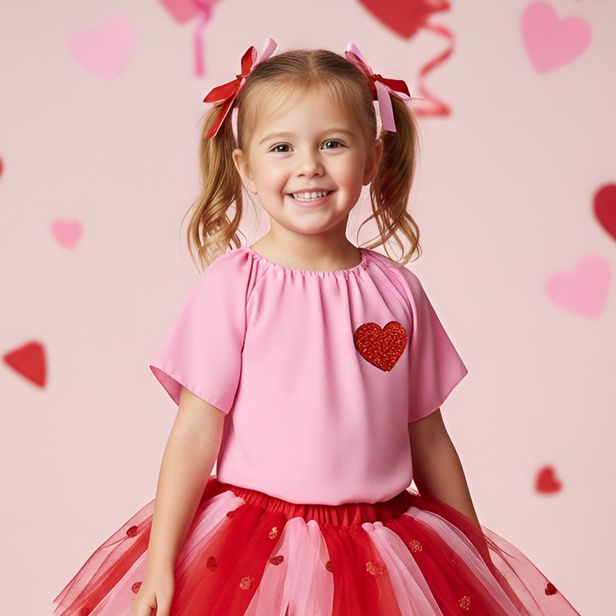 Oto różowa bluzeczka wykonana z lekkiego materiału pongee, która wyróżnia się czerwonym, brokatowym serduszkiem Dzięki temu koszulka świetnie się nadaje jako dodatek do stroju Amora lub wielu innych przebrań, dzięki któremu Twój Maluszek zabłyśnie na każdym przyjęciu!