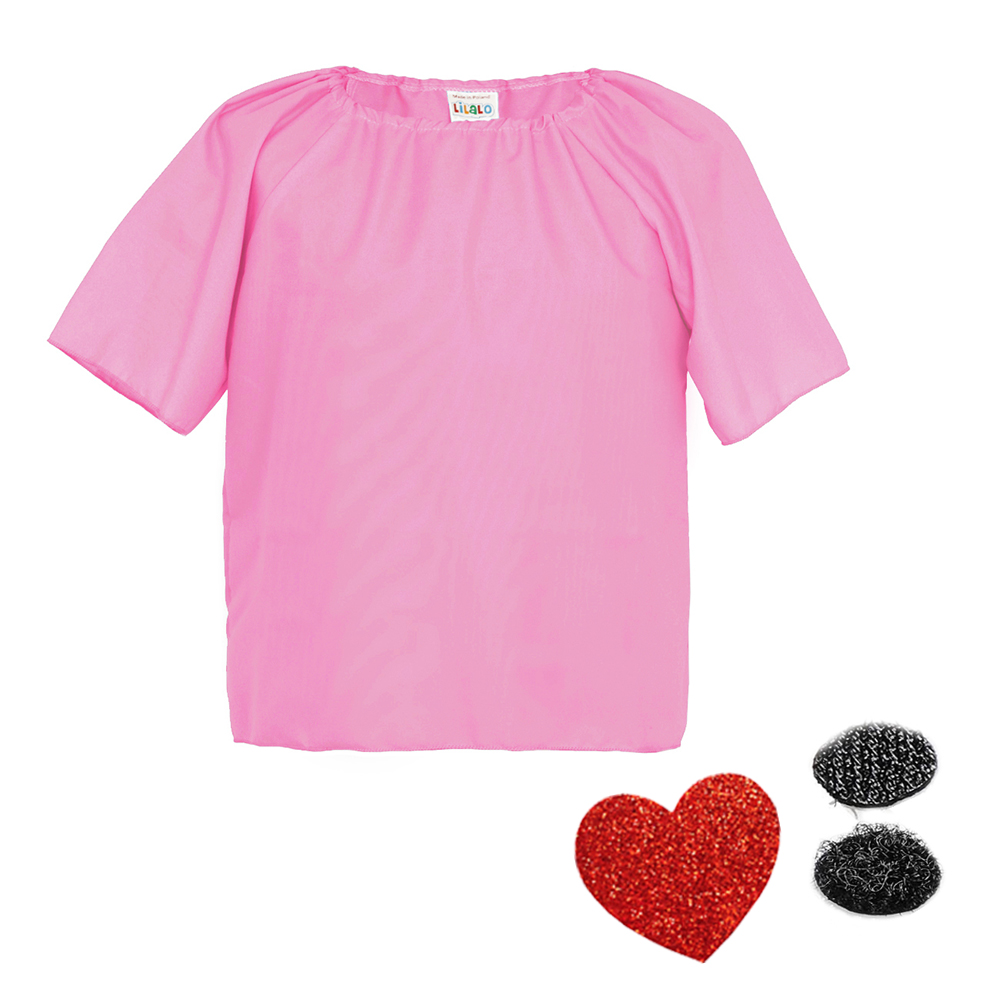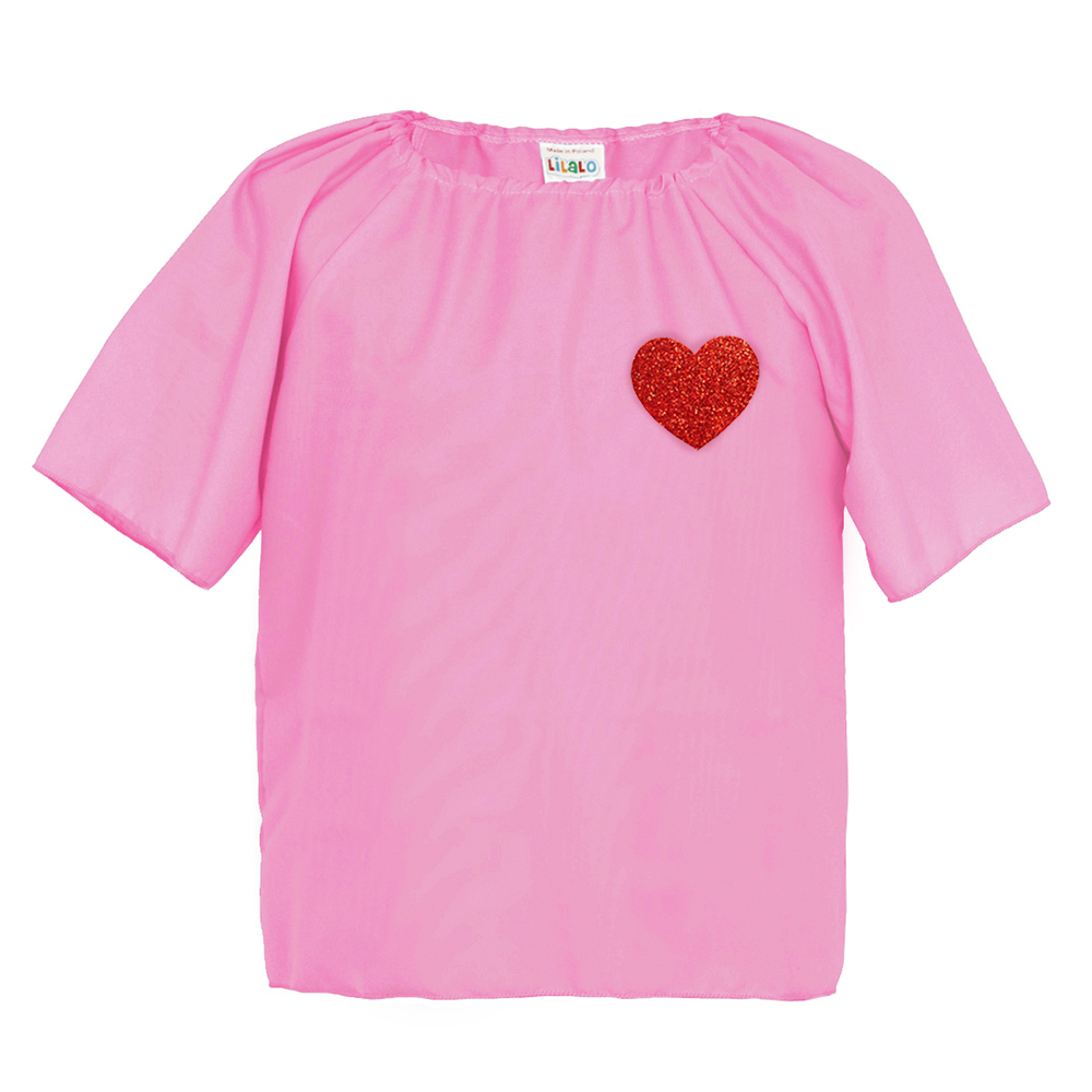 Oto różowa bluzeczka wykonana z lekkiego materiału pongee, która wyróżnia się czerwonym, brokatowym serduszkiem Dzięki temu koszulka świetnie się nadaje jako dodatek do stroju Amora lub wielu innych przebrań, dzięki któremu Twój Maluszek zabłyśnie na każdym przyjęciu!