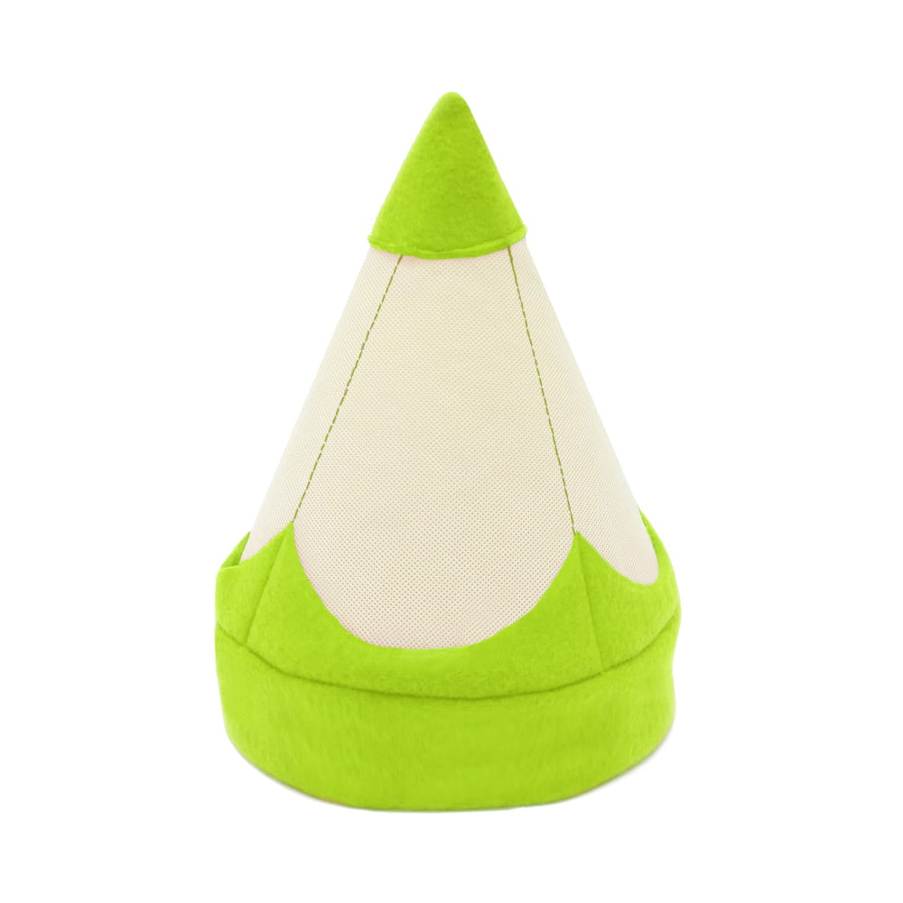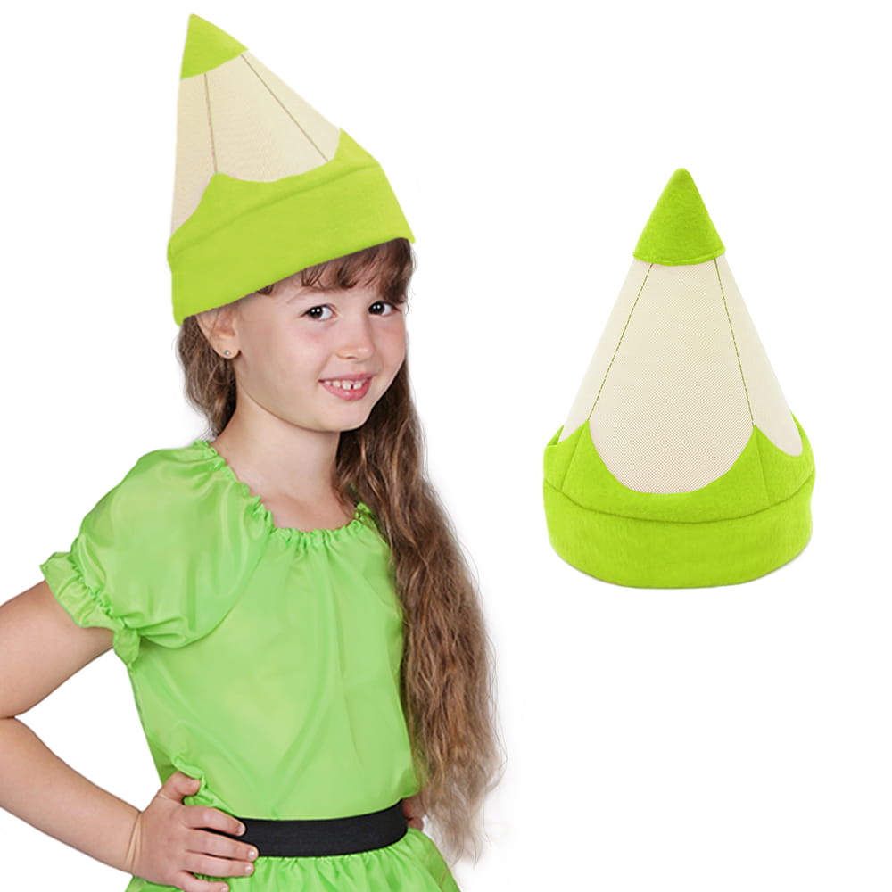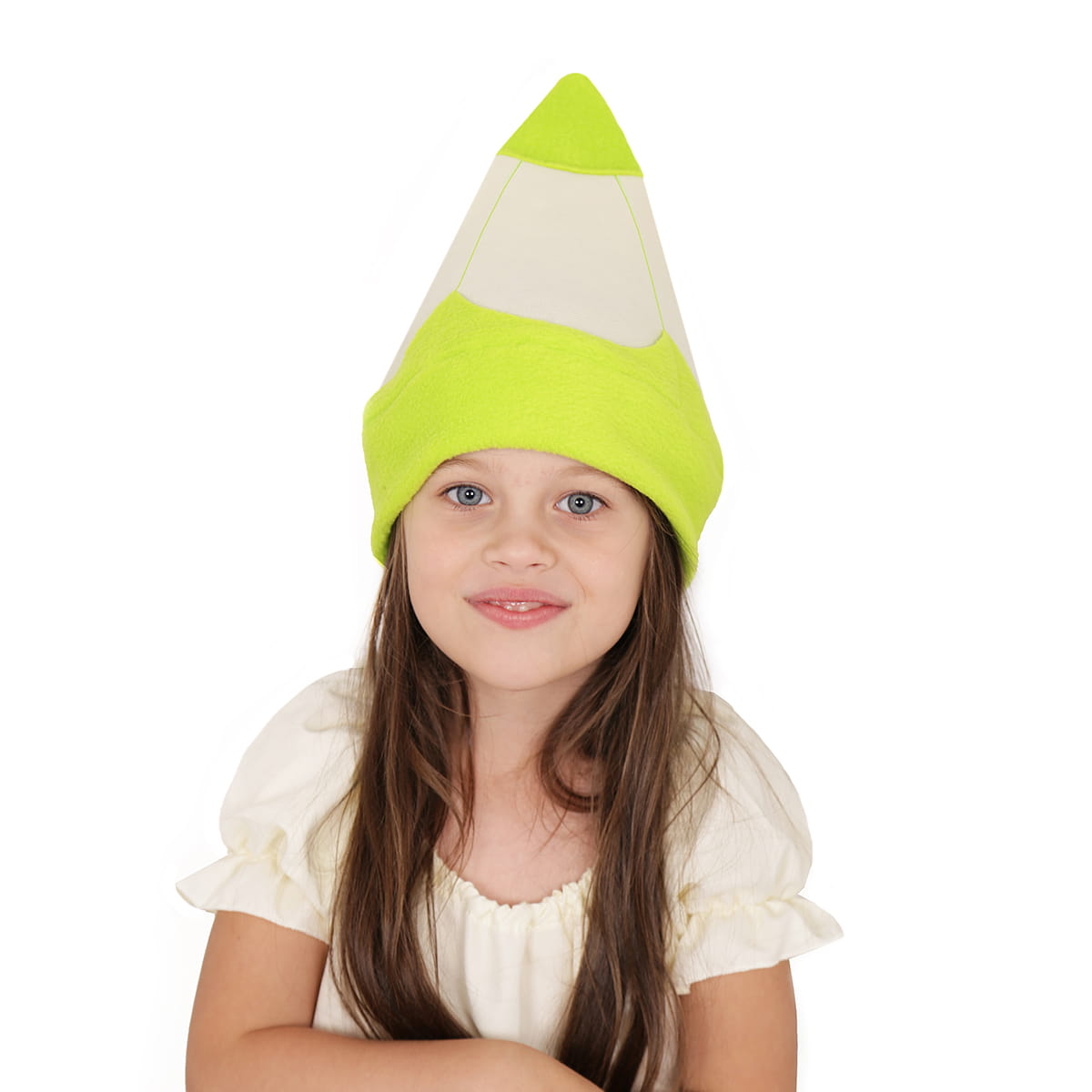 Wigofilowa, spiczasta czapeczka kredki obszyta na brzegu i na czubku polarem w kolorze jasnej zieleni sprawdzi się doskonale jako dodatek do stroju na Dzień Kredki!