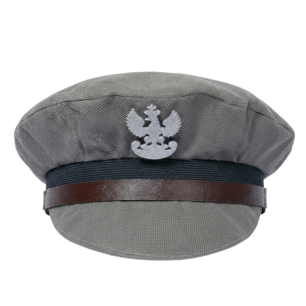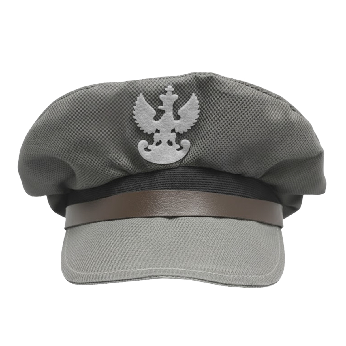 Czapka typu maciejówka, w uniwersalnym szarym kolorze, ma charakterystyczny, miękki krój i usztywniony daszek. Jest osadzona na czarnej, elastycznej gumce, która zapewnia uniwersalny rozmiar i idealne dopasowanie do każdej głowy, oraz ozdobiona brązowym paskiem nad daszkiem. To, co jednak wyróżnia ją najbardziej, to ozdobny, filcowy emblemat szarego orzełka, który nadaje jej oficjalnego, patriotycznego charakteru.