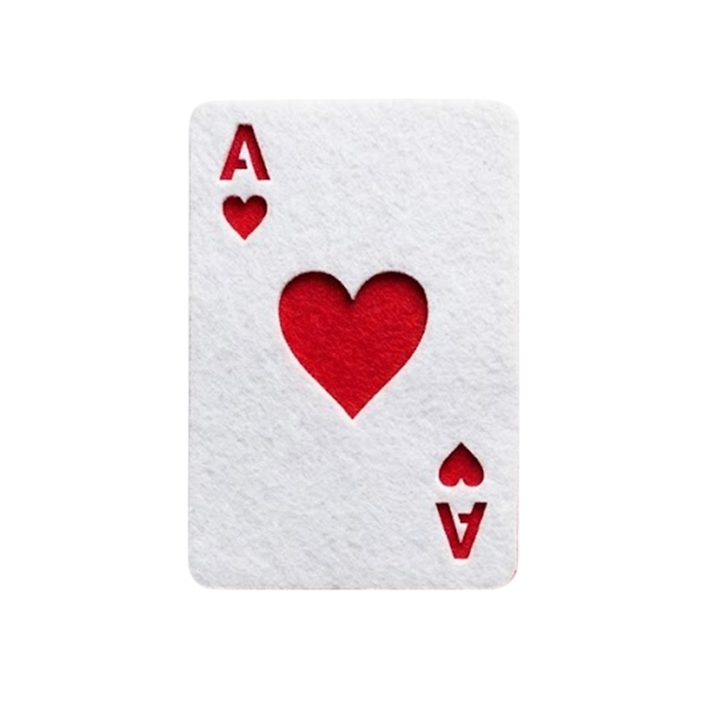 Dwuwarstwowy emblemat w kształcie karty as kier to klasyczna dekoracja wykonana z wysokiej jakości filcu. Czerwona baza stanowi tło dla białej nakładki, w której precyzyjnie wycięto symbole charakterystyczne dla tej karty. Dzięki kontrastowej kolorystyce i starannemu wykończeniu, as prezentuje się bardzo czytelnie i estetycznie.