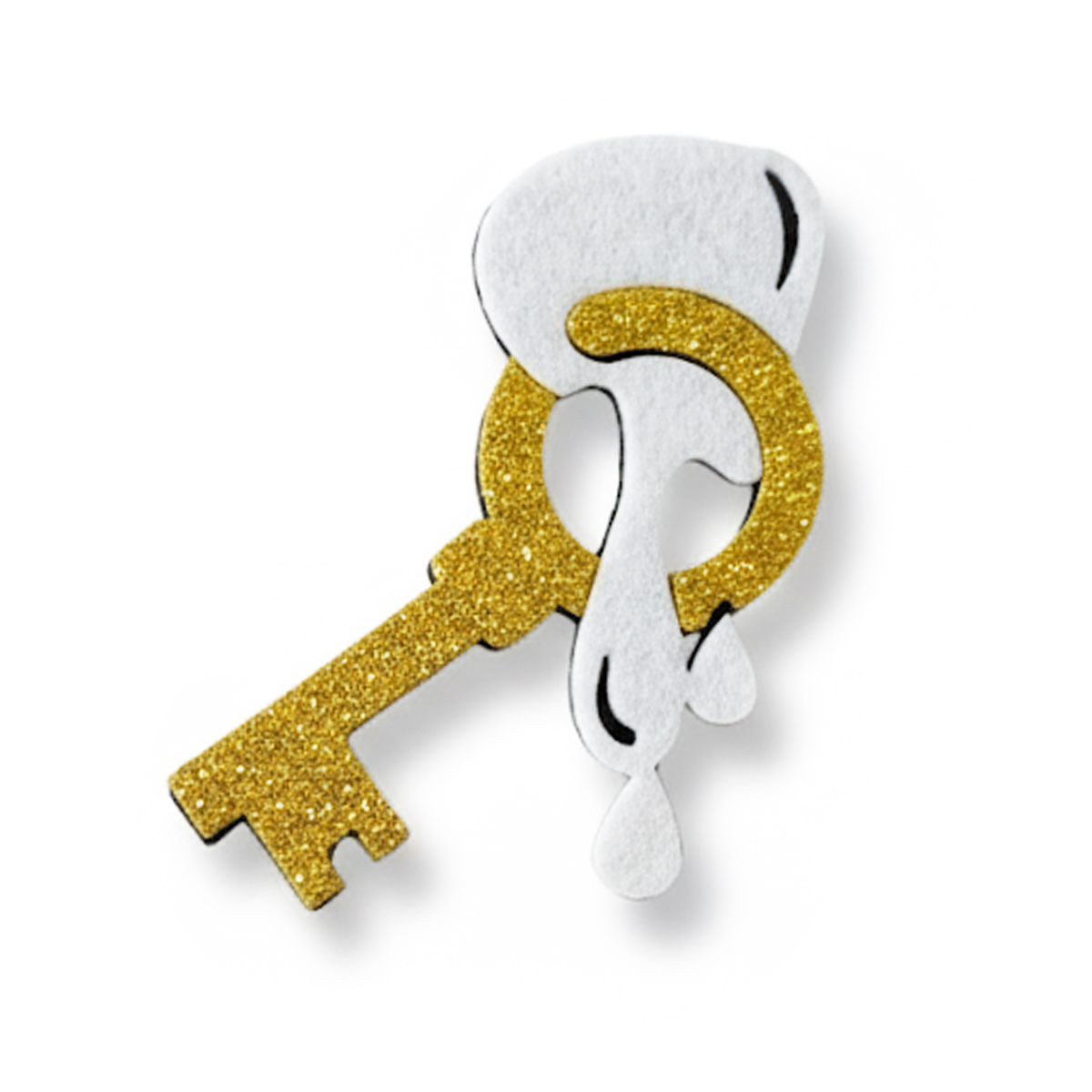 Emblemat idealnie odwzorowuje tradycyjny andrzejkowy symbol: złoty klucz i spływający wosk. Złoty klucz został wykonany z brokatowej pianki, która pięknie się mieni, symbolizując tajemnice i otwieranie przyszłości. Spływający wosk wykonano z miękkiego, białego filcu, co nadaje mu trójwymiarowego, realistycznego wyglądu. Całość ma czarny filcowy podkład, który gwarantuje trwałość i ułatwia mocowanie. Znakomicie się sprawdzi jako naszywka na ubranie lub element ozdobny do zaproszeń, banerów lub świeczników na andrzejkową imprezę!