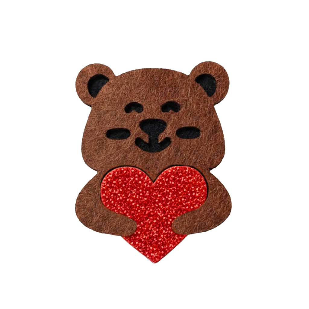 Element wykonany jest z wysokiej jakości filcu i składa się z trzech warstw: czarnej bazy oraz jasnobrązowej nakładki misia i czerwonego, piankowego serduszka. Każdy detal został starannie wycięty, aby nadać całości realistyczny wygląd i przyjemną fakturę. Misia możesz użyć jako naszywkę, podkładkę lub ozdobne fronty na koszyczki i pojemniki!
