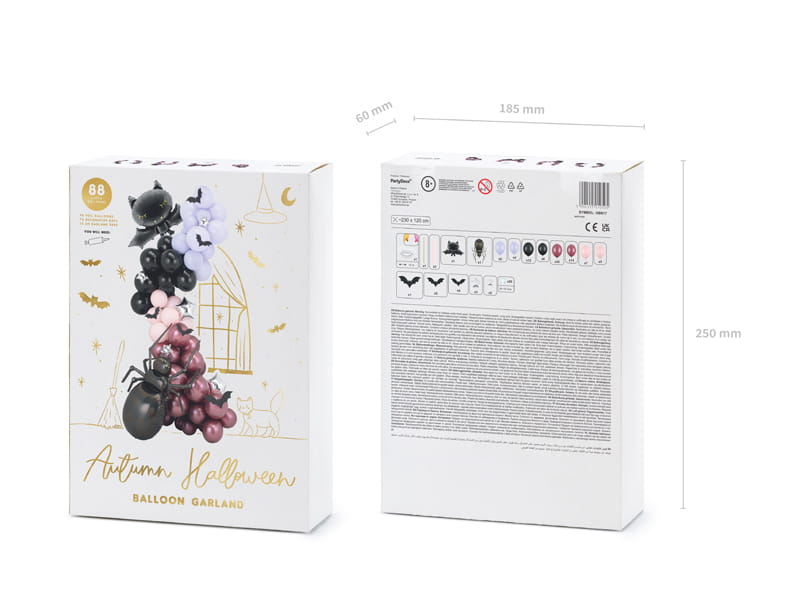 - Skład zestawu: 1. balony lateksowe (88 szt.); 2. balony modeliny (3 szt.), 3. balony foliowe (7 szt.); 4. papierowe nietoperze (7 szt.); 5. taśma piankowa; 6. słomka papierowa; 7. taśma do girland (5m)