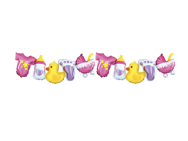 Girlanda balonowa przystrojona różowymi balonami w kształcie wózka, śpioszków, kaczuszki, stópki i butelki to doskonała ozdoba na babyshower i wiele innych okazji!