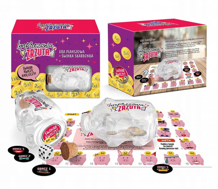 Imprezowa zrzutka to gra polegająca na wspólnym zebraniu funduszy na imprezowe zakupy! W zestawie znajdują się 6 pionków, plansza, kostka oraz szklana przezroczysta skarbonka w kształcie świnki!