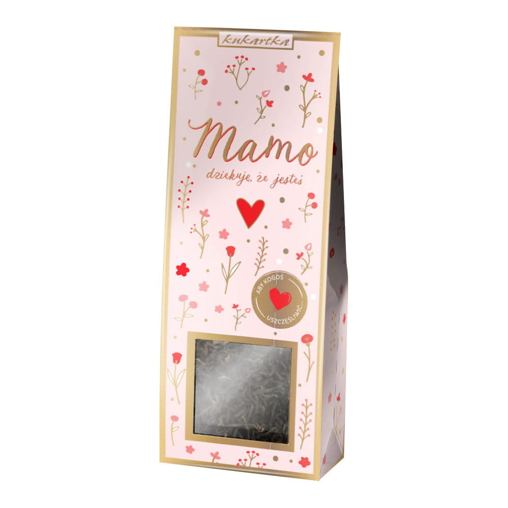 Herbata czarna o smaku płatków chabru/bławatka i olejku bergamotowego, opakowana w elegancki, różowy kartonik z napisem "Mamo, dziękuję że jesteś" sprawdzi się wspaniale jako upominek urodzinowy, prezent na Dzień Matki lub wiele innych okazji!