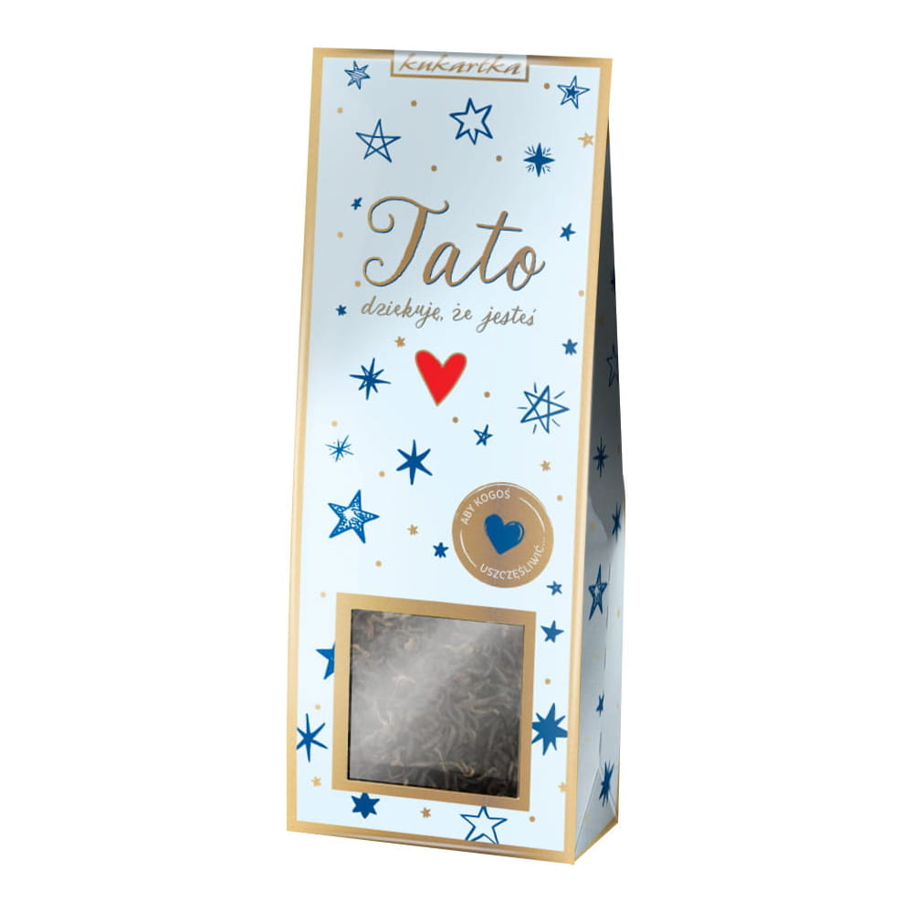 Herbata owocowa o smaku rodzynek, trawy cytrynowej, skórki cytryny i pomarańczy oraz o aromacie rumowo-cytrynowym, opakowana w elegancki, błękitny kartonik z gwiazdkami i napisem "Tato, dziękuję że jesteś" sprawdzi się wspaniale jako upominek urodzinowy, prezent na Dzień Ojca lub wiele innych okazji!