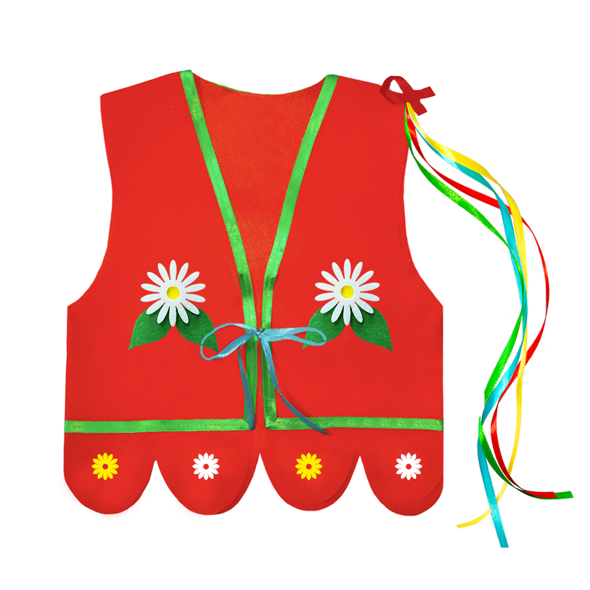 Serdaczek wykonany ze sztywnego materiału, ozdobiony kwiatowymi aplikacjami i cekinami, obszyty tasiemką, z przyszytymi do ramienia kolorowymi wstążkami.