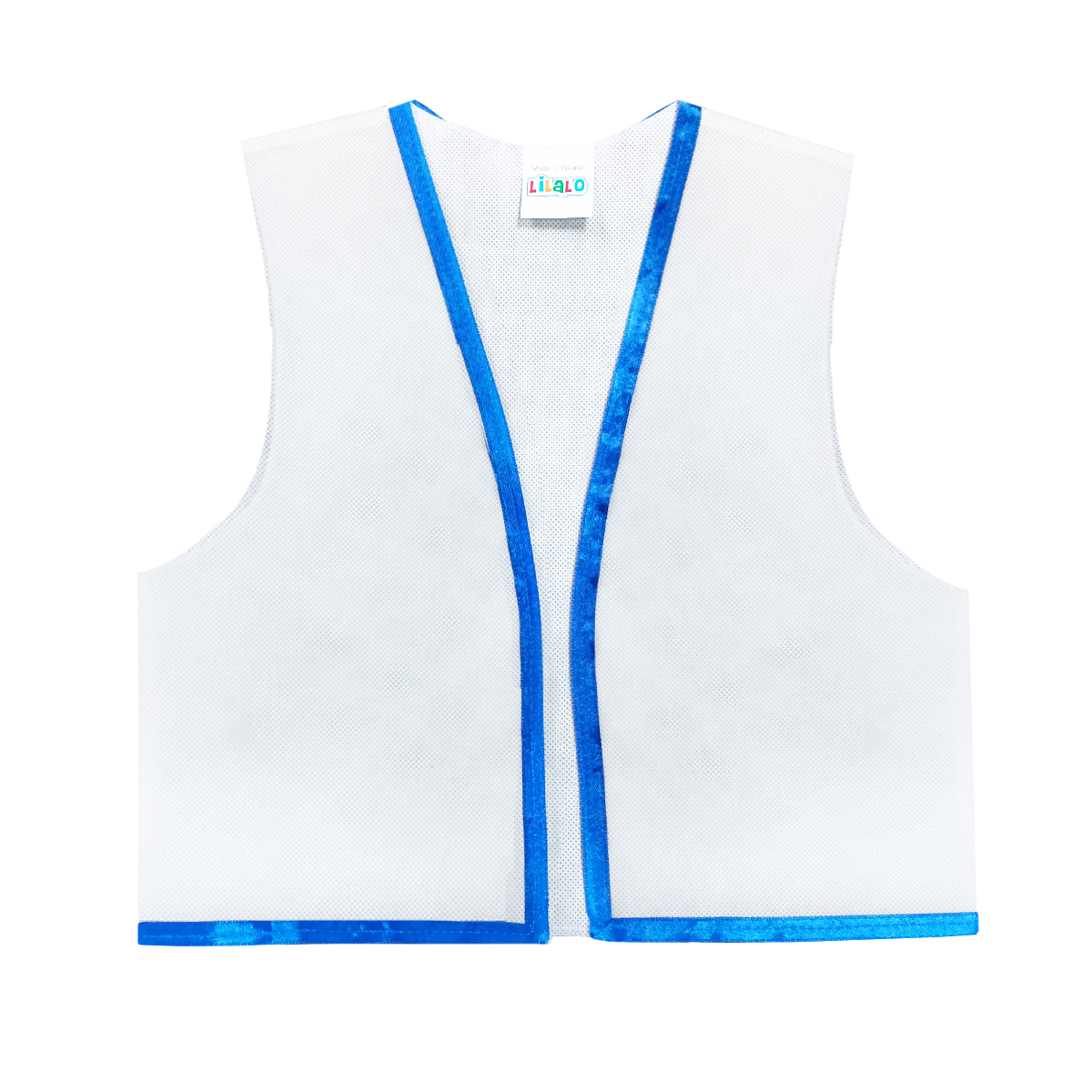 Kamizelka wykonana z wigofilu, w kolorze białym z niebieską obwódką idealnie się sprawdzi do kostiumu marynarza, smerfa, śnieżynki i wielu innych strojów!