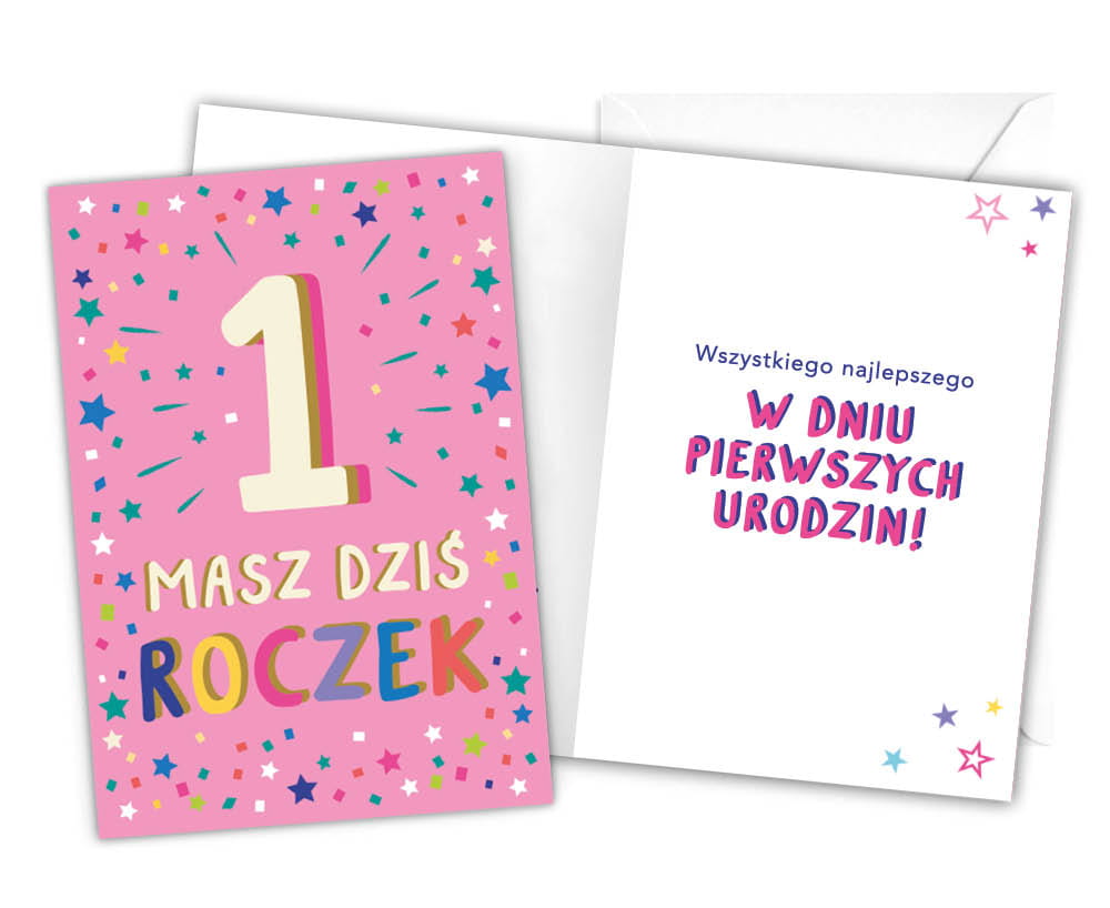 KARTKA 1 URODZINY ROCZEK RÓŻOWA LATKA LECĄ 18x12,5cm