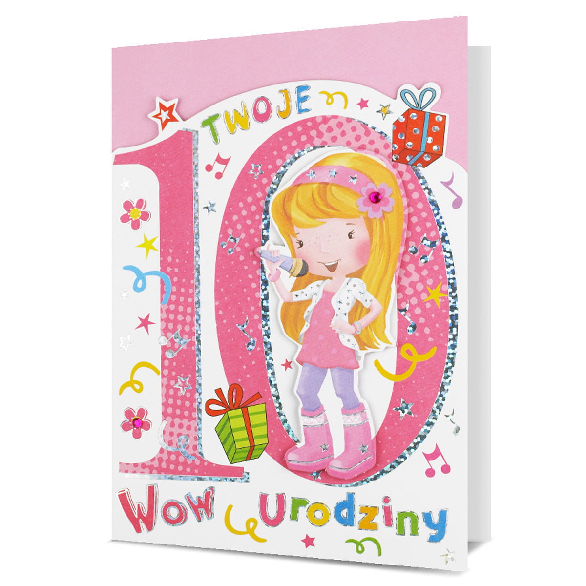 Kartka w kolorze różowym przedstawiająca radosną dziewczynkę z prezentami, dużą liczbę 10 oraz napis "Twoje 10 urodziny! Wow" idealnie się sprawdzi z okazji 10. urodzin!
