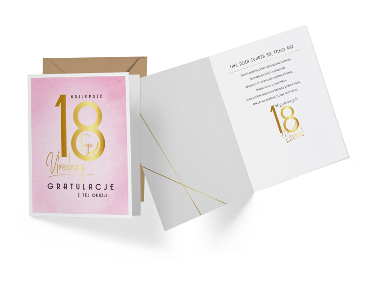 Kartka w kolorze różowym ozdobiona napisem "Najlepsze 18 urodziny Gratulacje z tej okazji" wraz z życzeniami w środku i dołączoną kopertą idealnie się sprawdzi z okazji 18 urodzin!