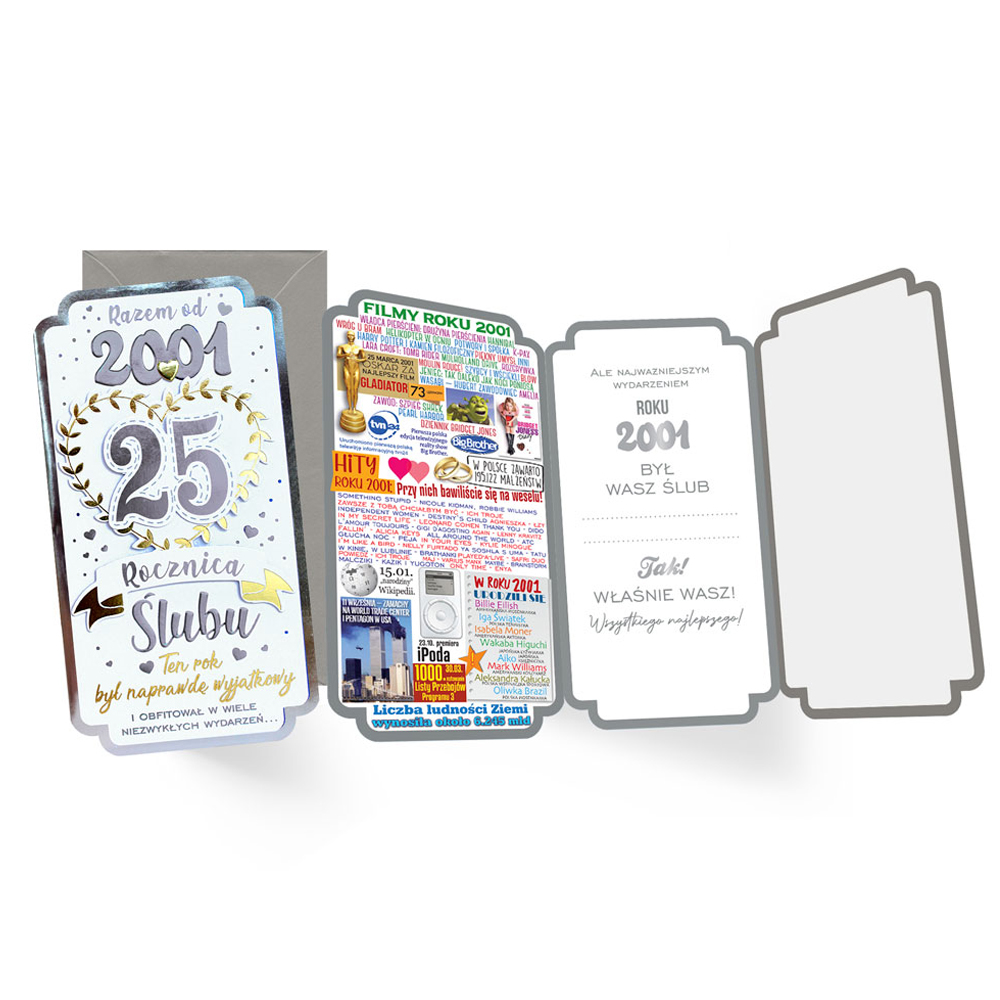 Ta wyjątkowa, rozkładana kartka to sentymentalna podróż w czasie, stworzona specjalnie na jubileusz 25-lecia małżeństwa! Jej projekt opiera się na ciekawostkach i faktach z 2001 roku, co czyni ją niezwykle osobistą pamiątką. Na okładce widnieje elegancki napis podkreślający wyjątkowość tamtego roku, a wnętrze wypełnione jest informacjami o największych hitach kinowych, muzycznych oraz ważnych wydarzeniach, które miały miejsce, gdy jubilaci brali ślub. Estetyczne wykończenie ze srebrnymi akcentami oraz symboliczne złote serce dodają całości elegancji. W środku znajduje się dedykowane miejsce na wpisanie daty i życzeń, co sprawia, że kartka staje się unikalnym świadectwem wspólnie przeżytych lat!