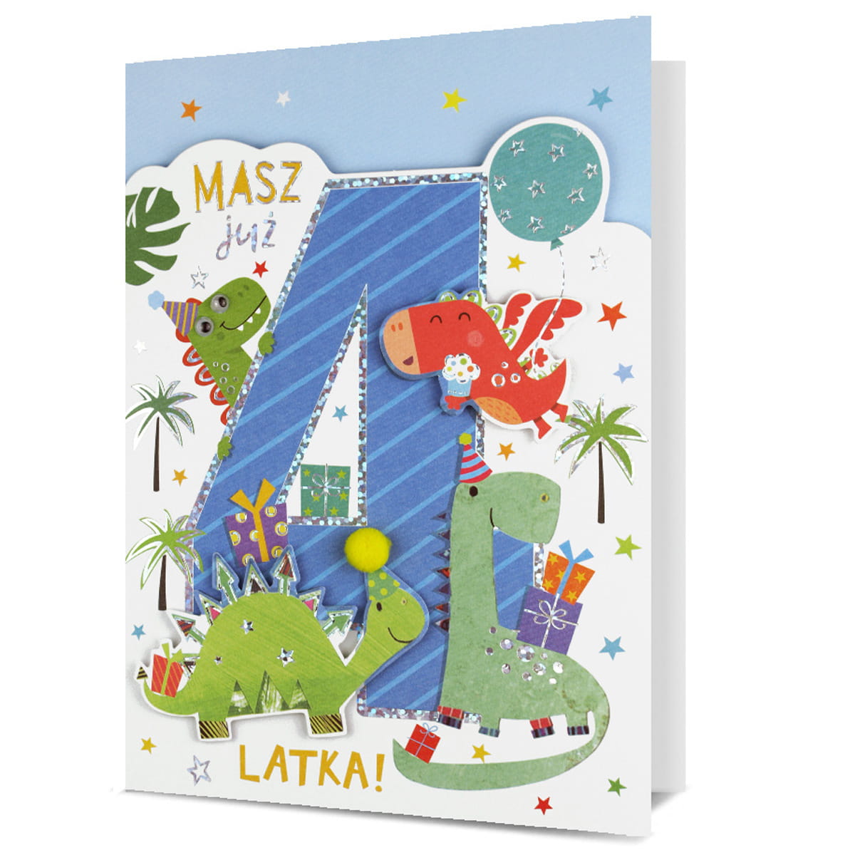 KARTKA 4 URODZINY PIN DINOZAURY BIAŁO-BŁĘKITNA 19x13cm
