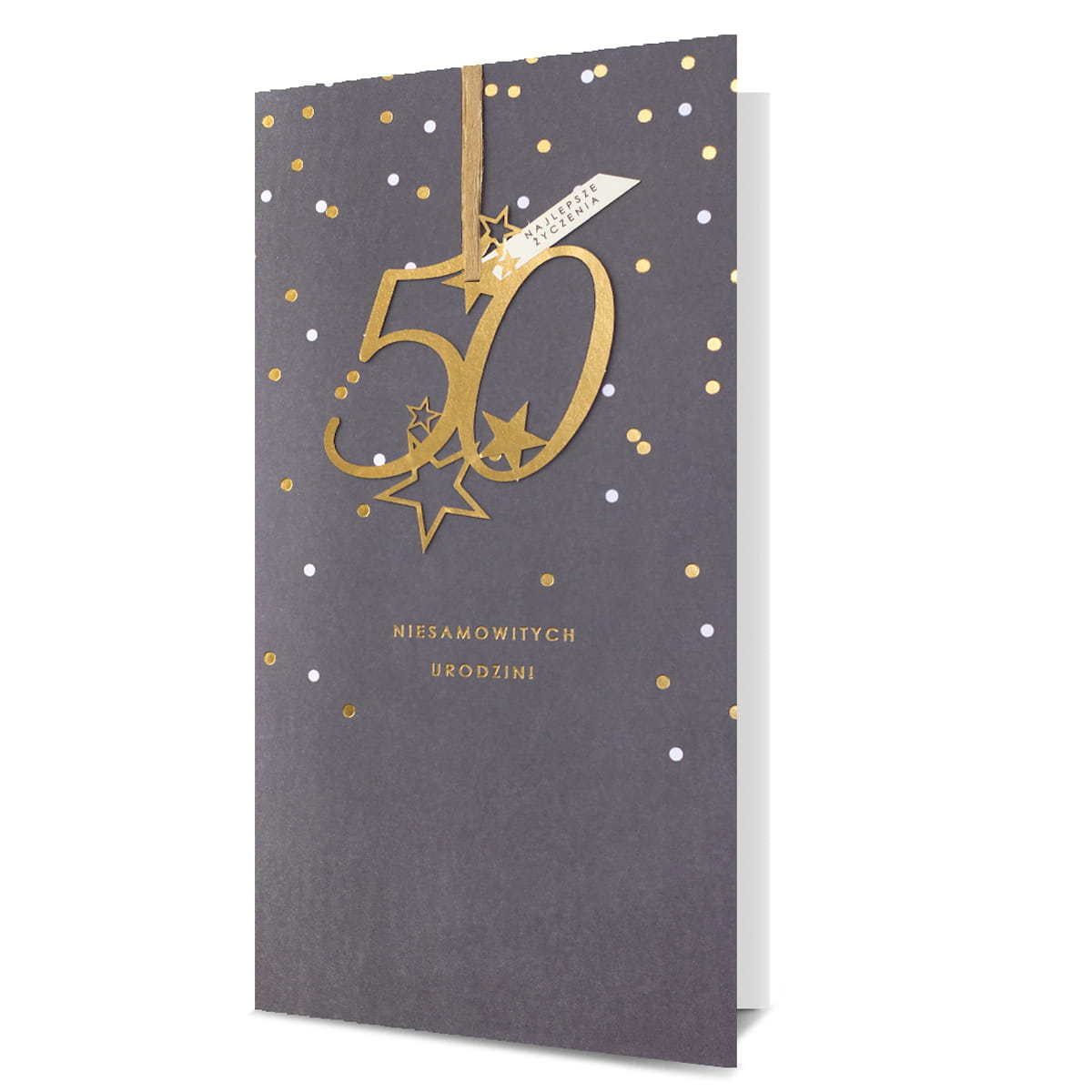 KARTKA 50 URODZINY GROSZKI SZARA 23x12cm
