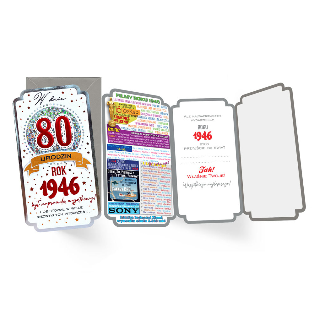 Szukasz ciekawego upominku na 80. urodziny? Oto wyjątkowa kartka urodzinowa w kolorach białym, czerwonym i srebrnym oraz ozdobiona napisem "W dniu 80 urodzin. Rok 1946 był naprawdę wyjątkowy i obfitował w wiele niezwykłych wydarzeń. Wewnątrz kartki znajdują się życzenia wraz z miejscem na własny dopisek, do zestawu dołączona jest także koperta. Jednak największym atutem kartki są ciekawostki dotyczące roku 1946! Interesujące fakty dotyczą wielu różnych dziedzin, m.in. historii, kultury czy polityki, dzięki czemu każdy znajdzie tam coś, co go zadziwi!