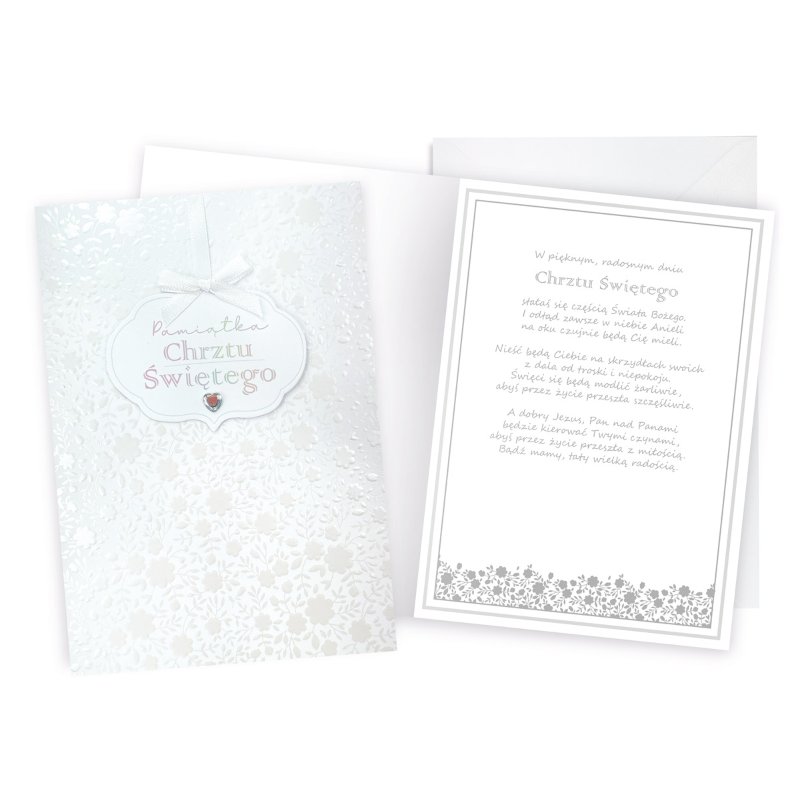 KARTKA CHRZEST KWIATY TŁOCZONE BIAŁA 19x14cm
