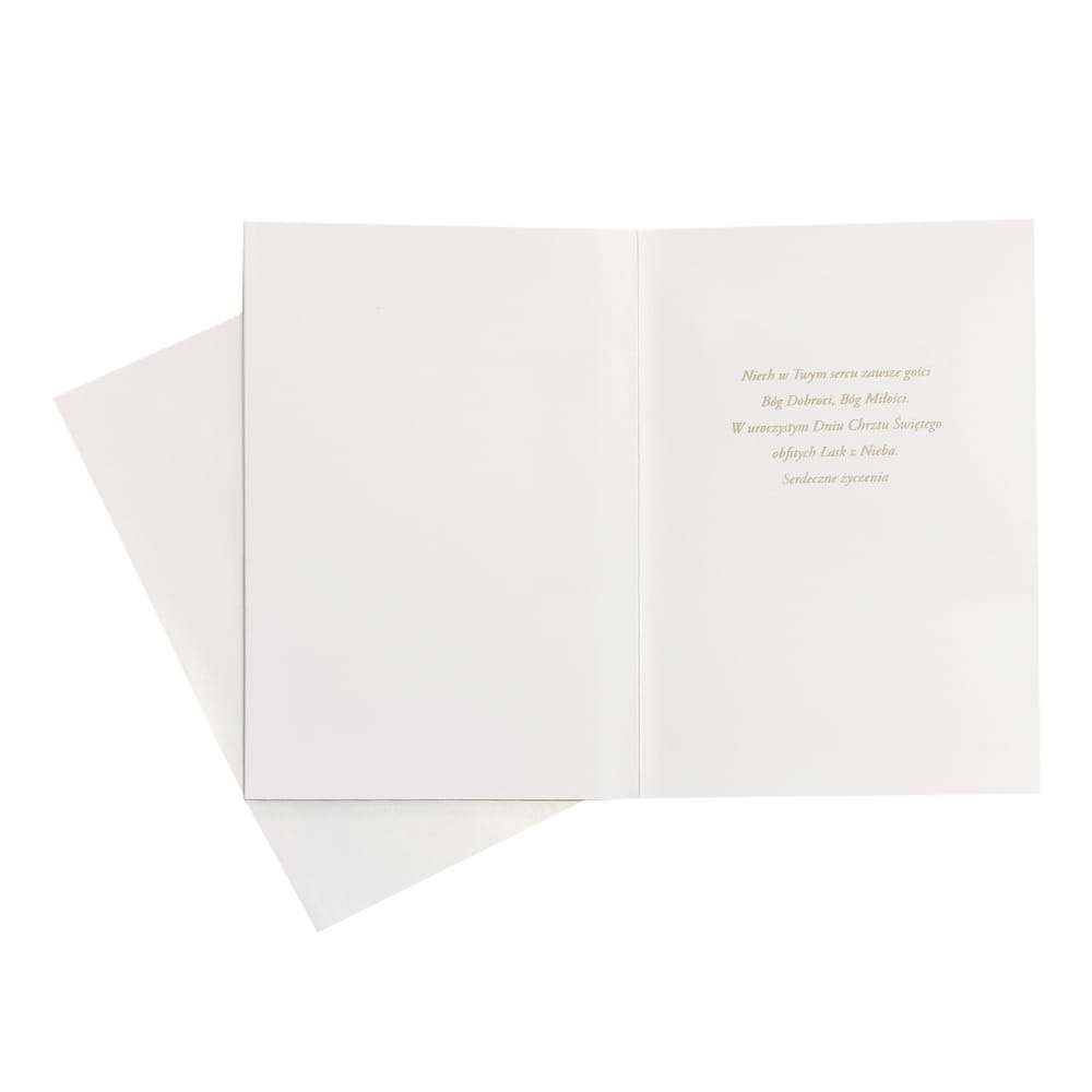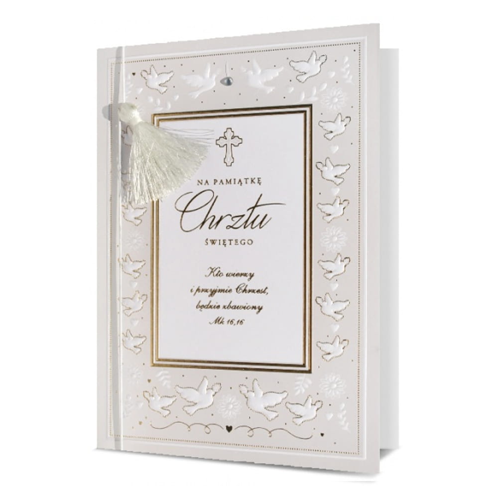 Kartka w kolorze białym, ozdobiona tłoczonymi gołębiami, białym frędzelkiem oraz napisem "Na pamiątkę Chrztu Świętego Kto wierzy i przyjmie Chrzest, będzie zbawiony" sprawdzi się idealnie z okazji chrztu!