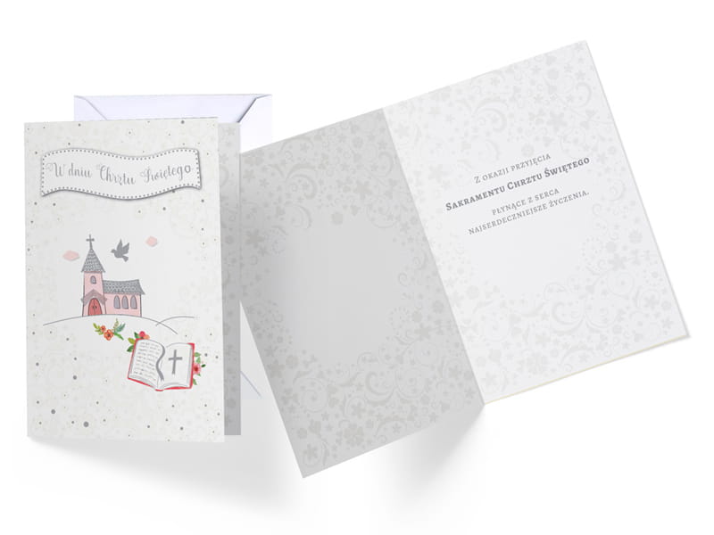 Kartka w kolorze białym, ozdobiona niebieskim kościółkiem i otwartą księgą wraz z napisem "W dniu Chrztu Świętego" sprawdzi się idealnie z okazji chrztu!