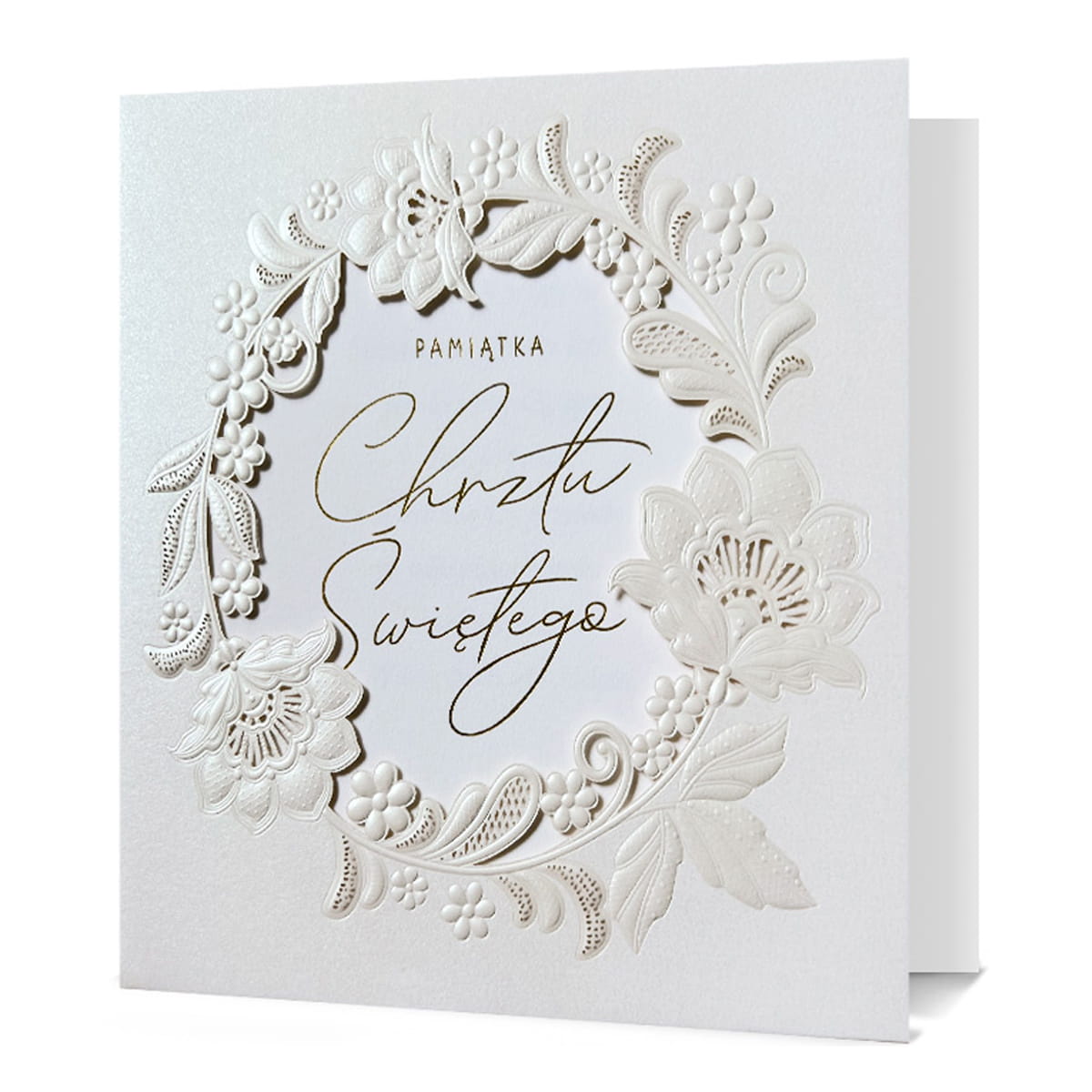 Kartka w kolorze białym, ozdobiona kwietnym wieńcem oraz napisem "Pamiątka Chrztu Świętego", wraz z życzeniami w środku oraz dołączoną kopertą sprawdzi się idealnie z okazji chrztu!