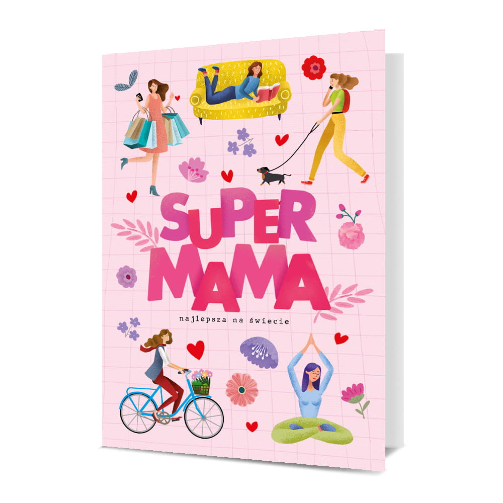 Kartka w kolorze różowym z nadrukiem "Super mama najlepsza na świecie" oraz ozdobiona kolorowymi grafikami kobiet sprawdzi się idealnie z okazji Dnia Matki!