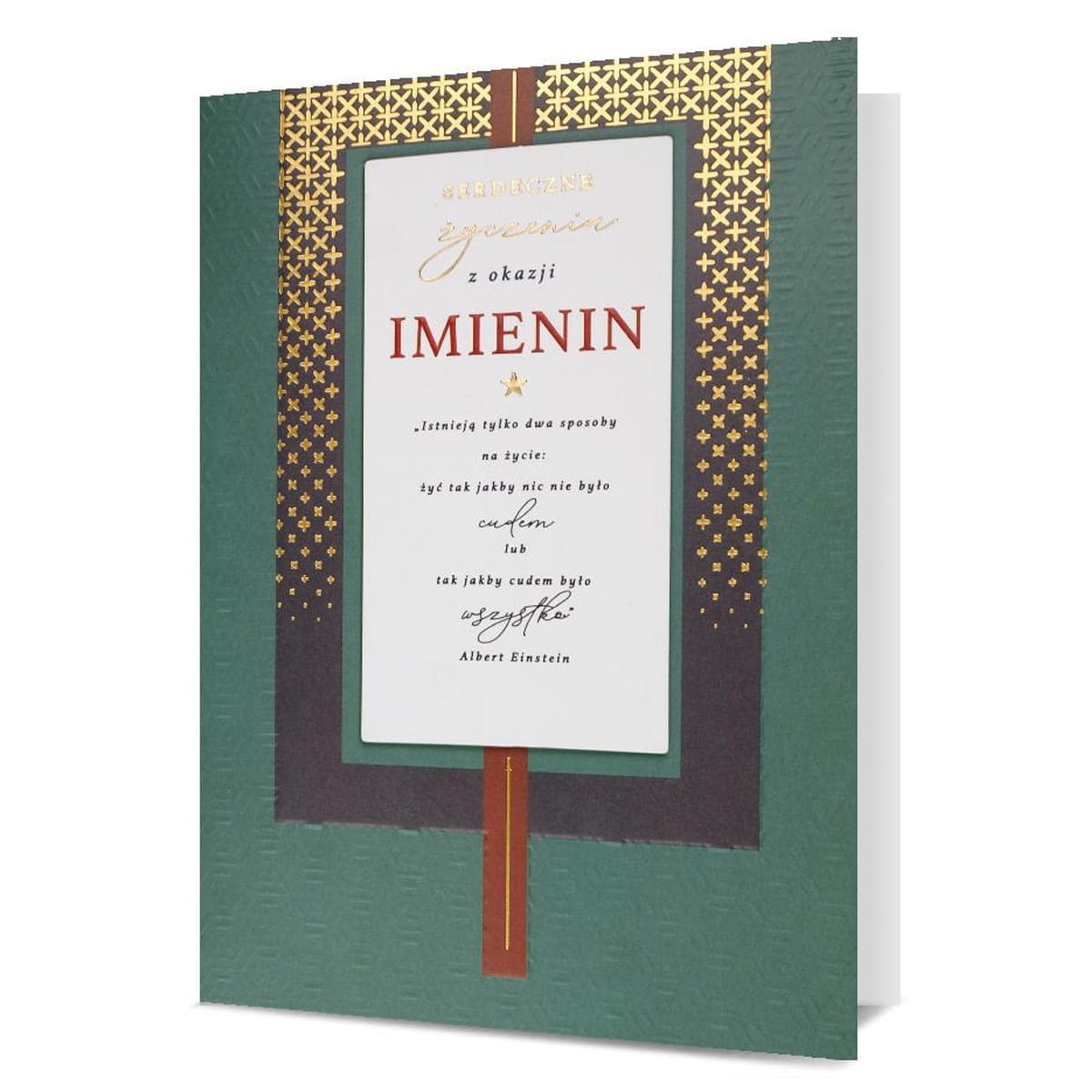 Zielono-złota, elegancka kartka ozdobiona napisem "Serdeczne życzenia z okazji Imienin", wraz z sentencją, życzeniami w środku oraz dopasowaną kolorystycznie kopertą idealnie się sprawdzi z okazji imienin!