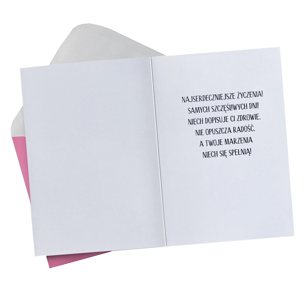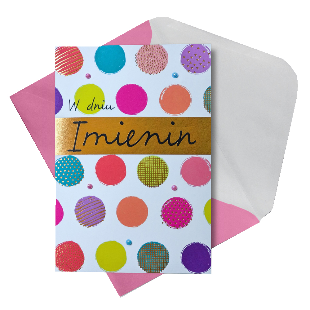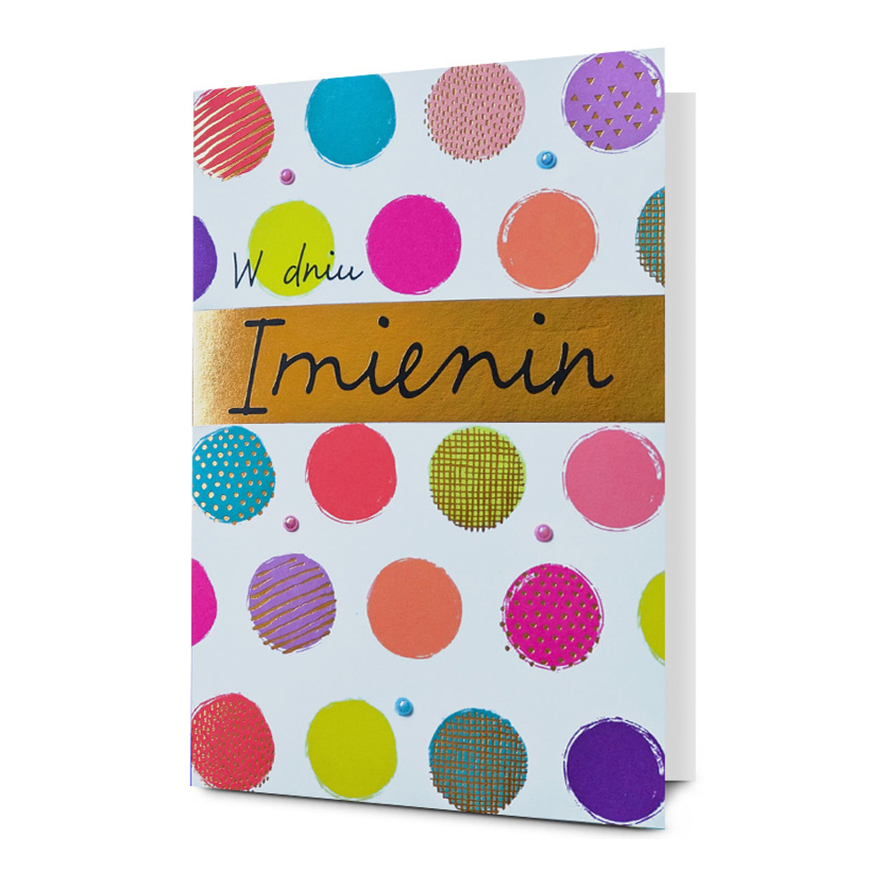 Zbliżają się imieniny ważnej dla Ciebie osoby i chcesz jej sprawić miły upominek? Kartka z życzeniami to prosty sposób, aby wywołać uśmiech na twarzy solenizanta! Biała kartka udekorowana kolorowymi groszkami oraz napisem "W dniu imienin". W środku znajdują się życzenia z miejscem na własną adnotację oraz dopasowana kolorystycznie koperta.