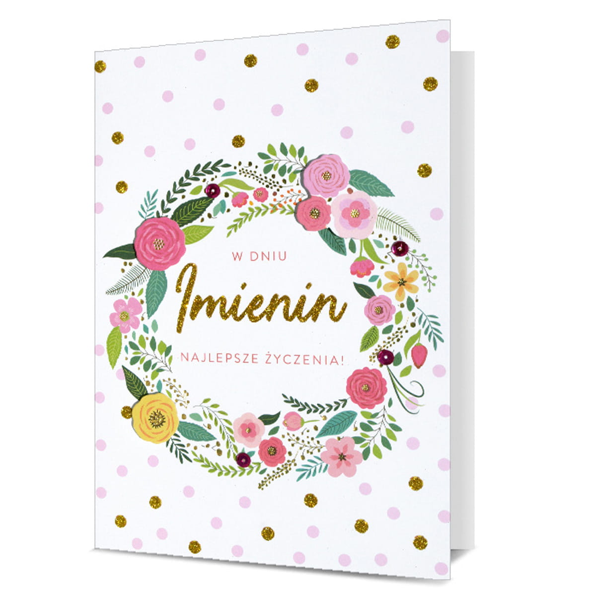 Kartka w kolorze białym ozdobiona kolorowymi groszkami, kwietnym wieńcem oraz napisem "W dniu imienin najlepsze życzenia", wraz z życzeniami w środku oraz dopasowaną kolorystycznie kopertą idealnie się sprawdzi z okazji imienin!