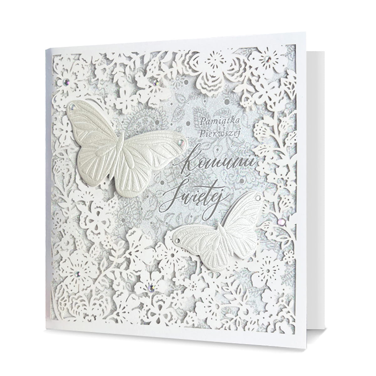 KARTKA KOMUNIA PAMIĄTKA I KOMUNII MOTYL KWIATY BIAŁA 18x19cm