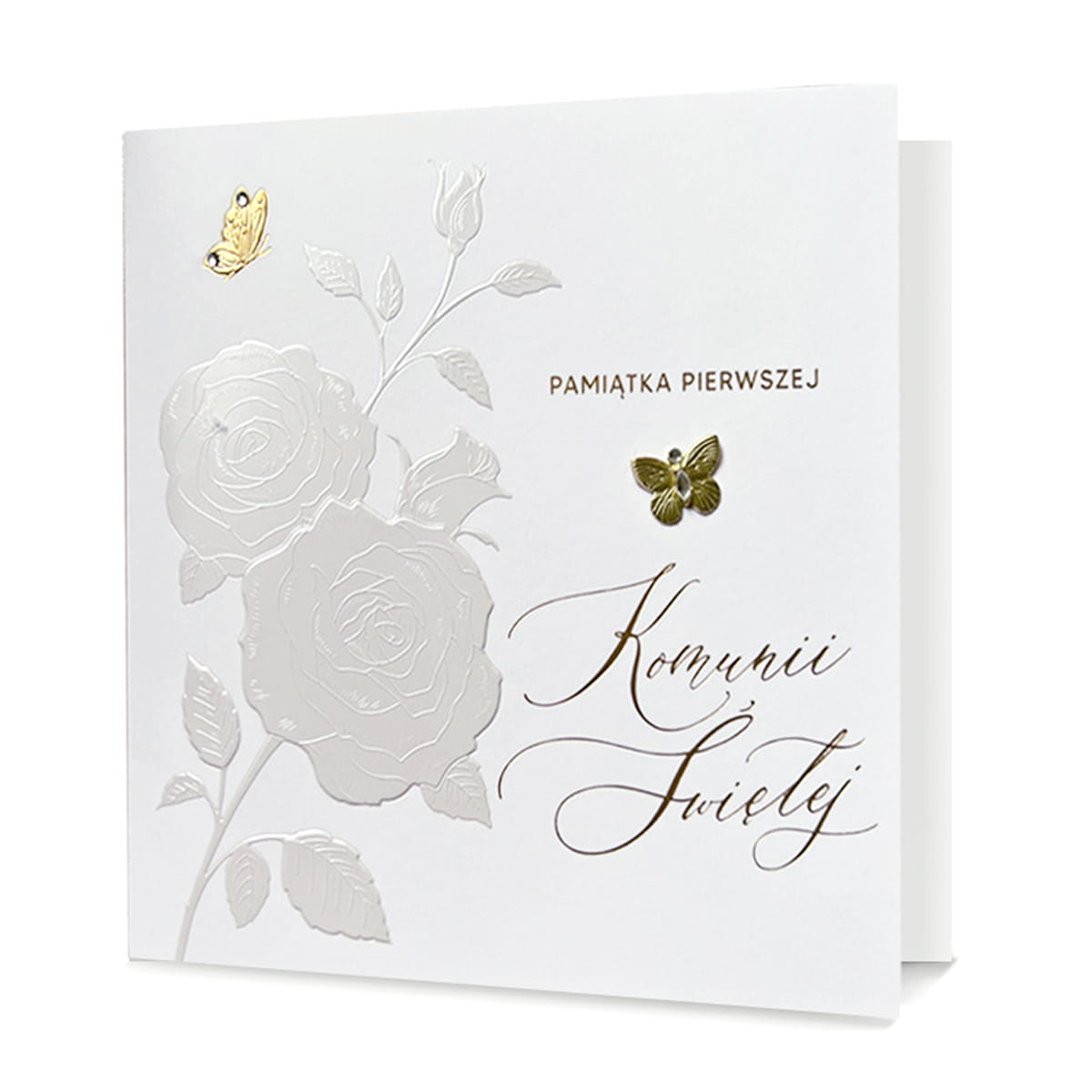 Beżowa kartka z życzeniami ozdobiona białymi różami, motylkami oraz napisem "Pamiątka Pierwszej Komunii Świętej", wraz z dopasowaną kolorystycznie kopertą sprawdzi się świetnie jako komunijny upominek!