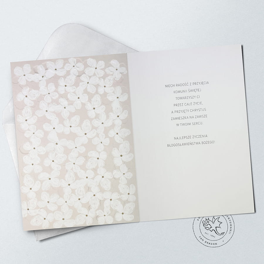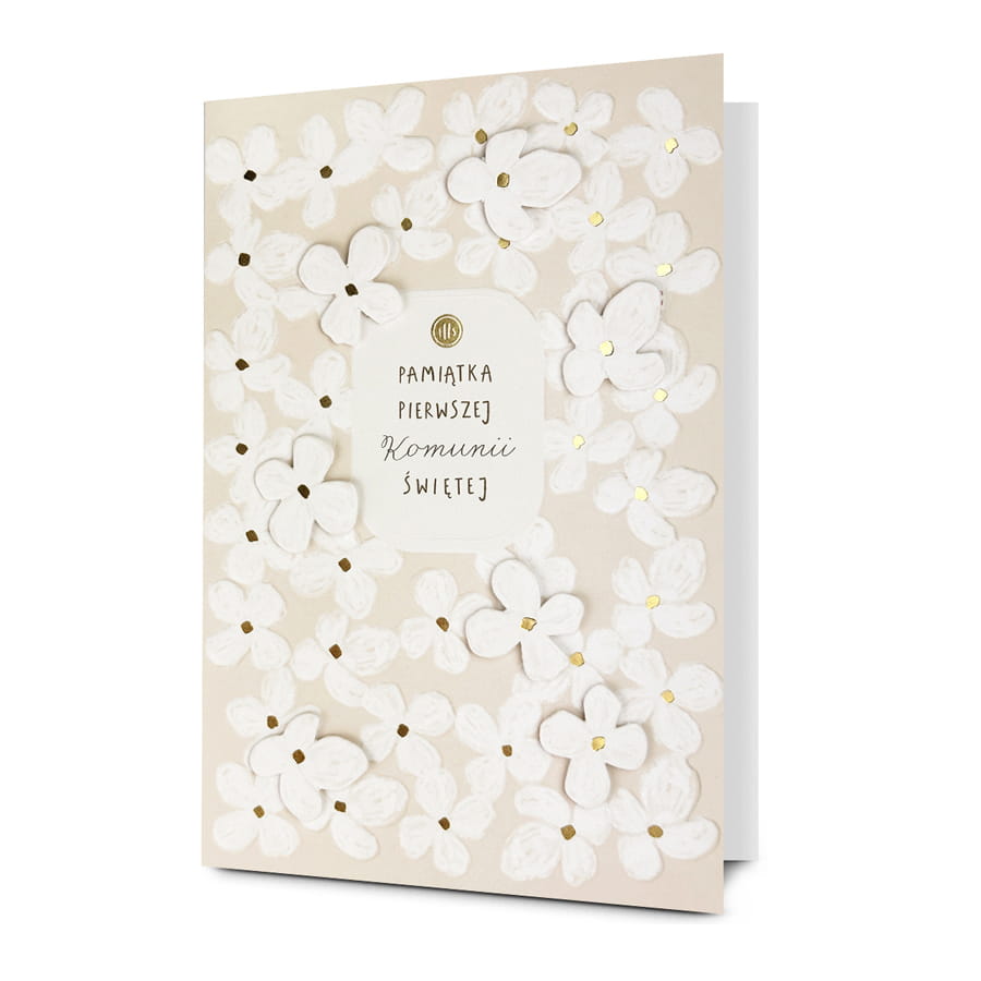 Beżowa kartka z życzeniami ozdobiona białymi, delikatnymi kwiatkami oraz eleganckim napisem "Pamiątka Pierwszej Komunii Świętej" sprawdzi się świetnie jako komunijny upominek!