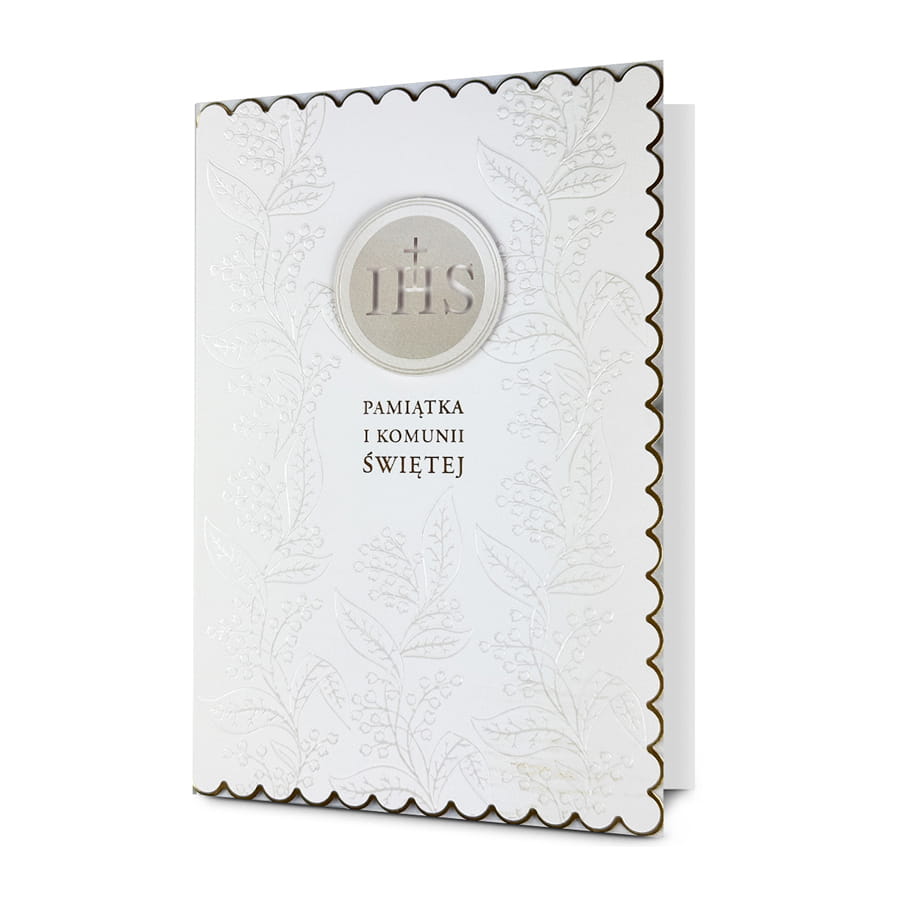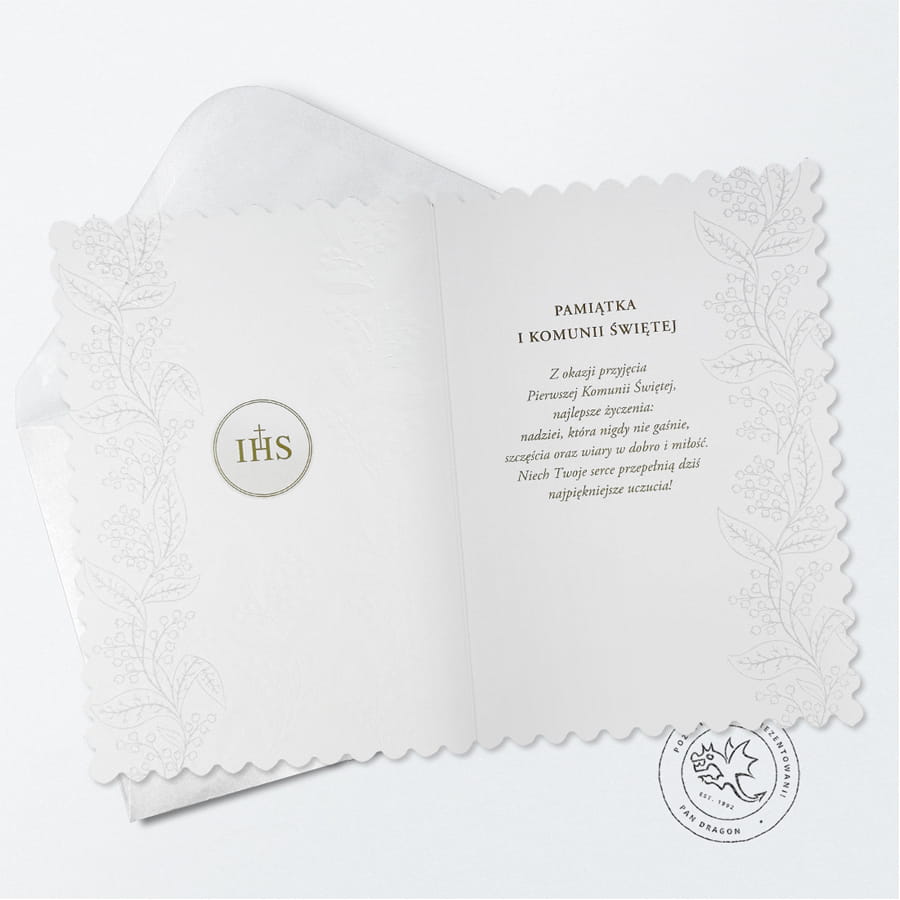 Biała kartka z życzeniami ozdobiona delikatnymi kwiatkami oraz eleganckim napisem "Pamiątka I Komunii Świętej" sprawdzi się świetnie jako komunijny upominek!