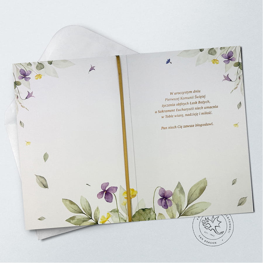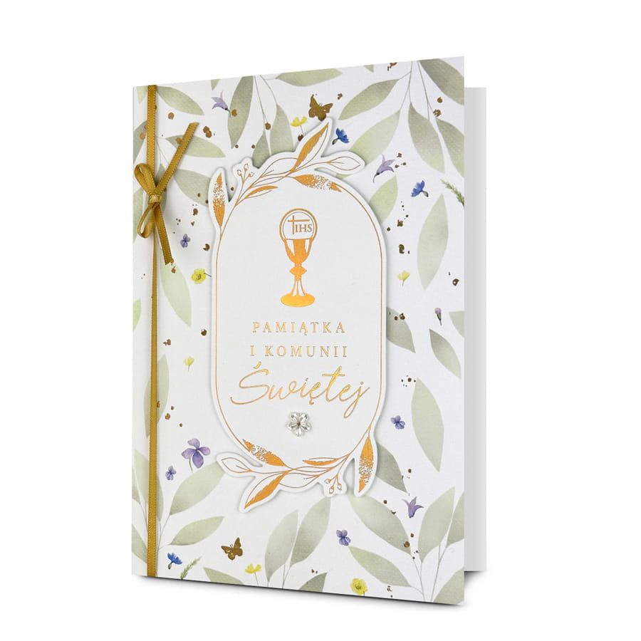 Biała kartka z życzeniami ozdobiona jasnozielonymi listkami, złotą wstążką oraz napisem "Pamiątka I Komunii Świętej" sprawdzi się świetnie jako komunijny upominek!