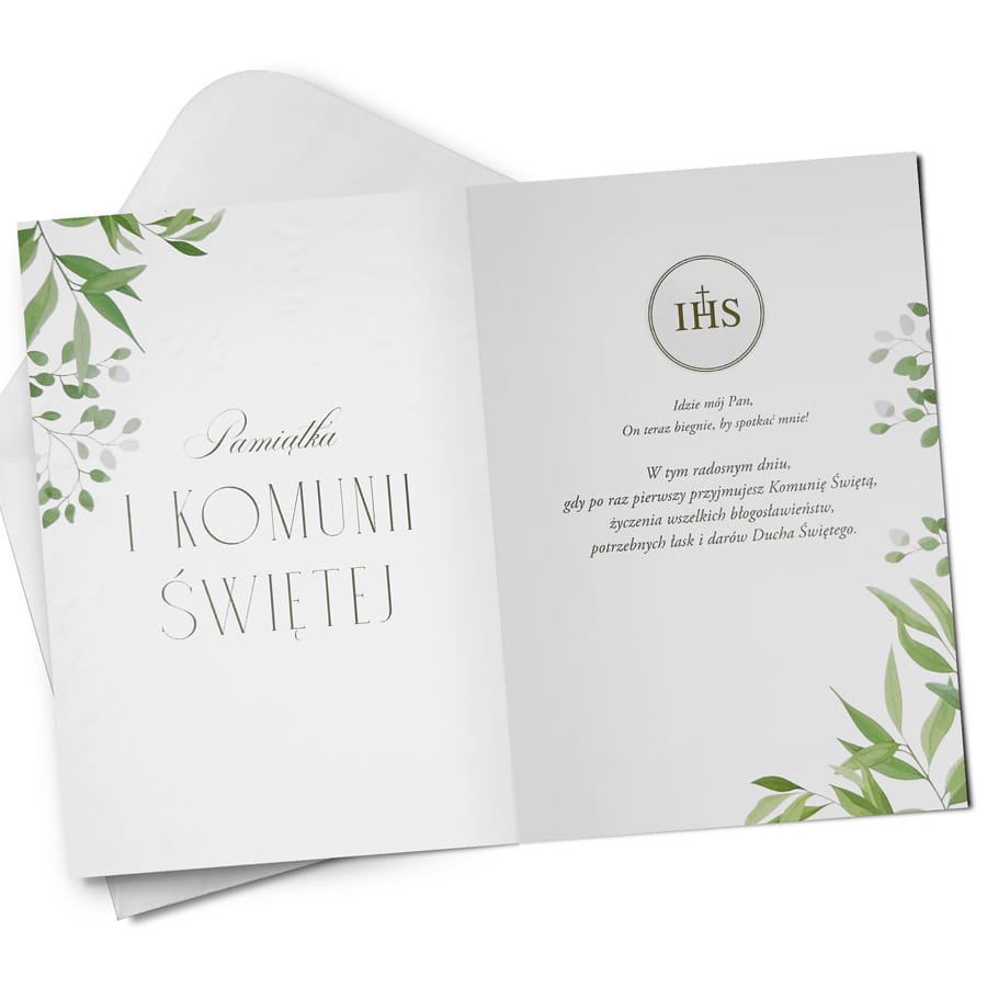 KARTKA KOMUNIA PAMIĄTKA KOMUNII PASEK LISTKI BIAŁA 19x13cm