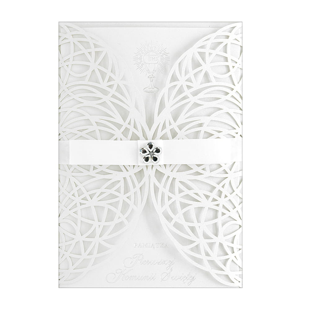 Biała kartka z życzeniami ozdobiona srebrnym kwiatkiem oraz napisem "Pamiątka Pierwszej Komunii Świętej" sprawdzi się świetnie jako komunijny upominek!