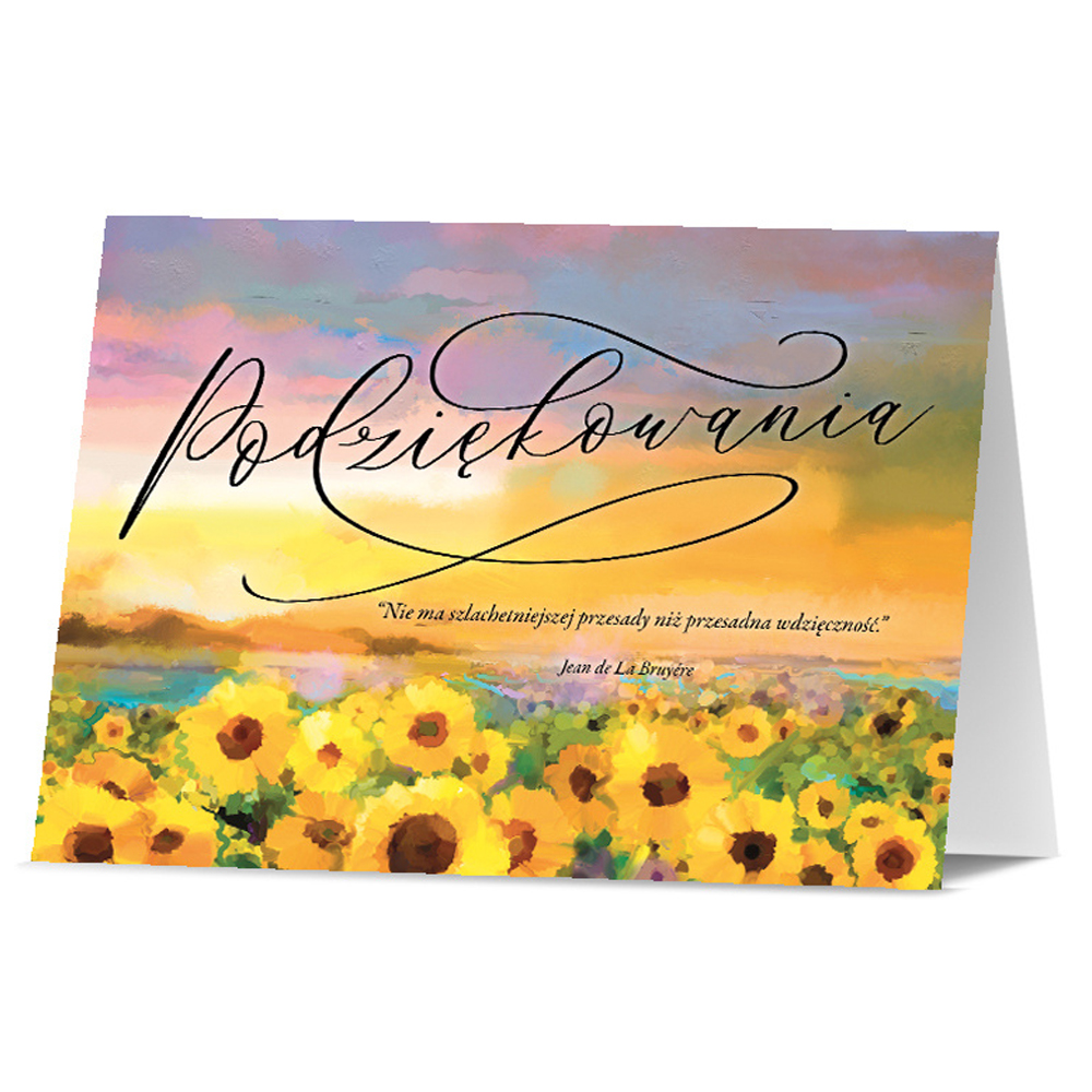 Szukasz uniwersalnego upominku, dzięki któremu podziękujesz bliskiej sobie osobie? Podaruj kartkę, dzięki której wyrazisz całą swoją wdzięczność! Ozdobna kartka z malowniczym widokiem na pole słoneczników o zachodzie słońca oraz czarnym napisem "PODZIĘKOWANIA" i krótkim cytatem "Nie ma szlachetniejszej przesady niż przesada wdzięczności" Jean de La Bruyère. W środku znajduje się miejsce na życzenia i własną adnotację.