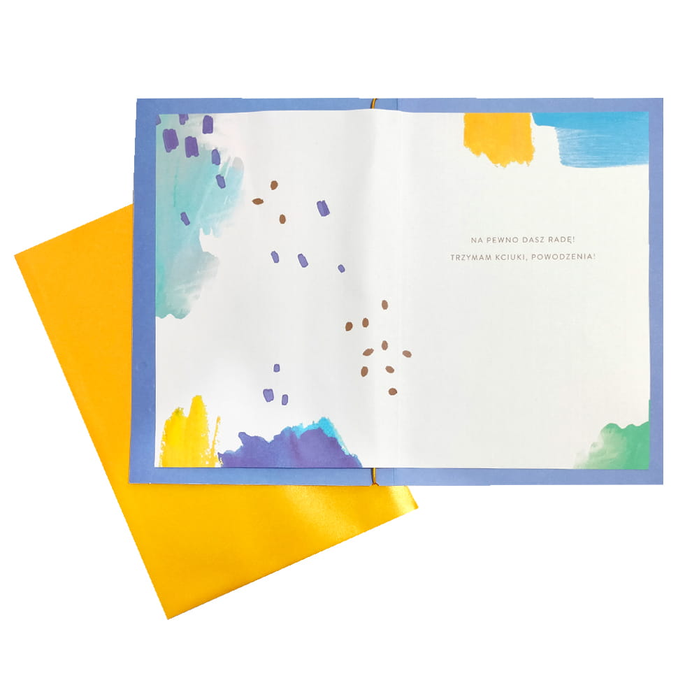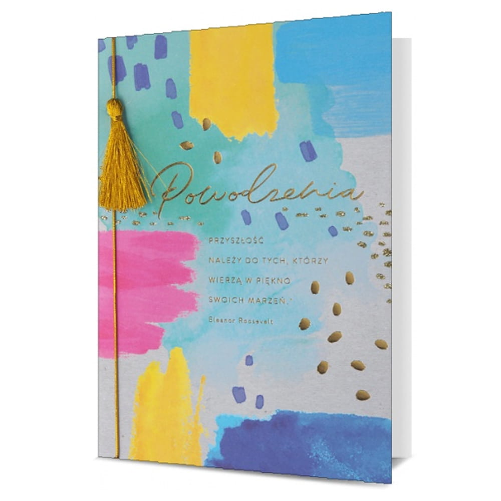 Kolorowa kartka ozdobiona złotym frędzelkiem oraz napisem "Powodzenia" wraz z dołączonym cytatem Eleanor Roosevelt: "Przyszłość należy do tych, którzy wierzą w piękno swoich marzeń" sprawdzi się doskonale na wiele okazji!