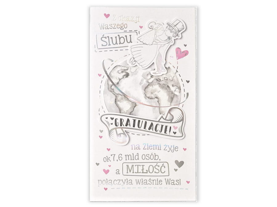Kartka w kolorze białym ozdobiona planetą Ziemią, na której stoi Para Młoda, wraz z napisem Z okazji Waszego Ślubu gratulacje! Na Ziemi żyje ok. 7,6 mld ludzi, a miłość połączyła właśnie Was!" idealnie się sprawdzi z okazji ślubu!