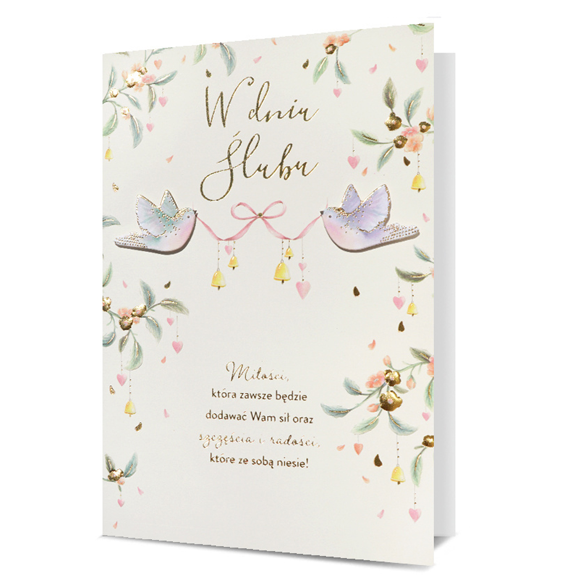 Kartka w kolorze beżowym, ozdobiona kwiatami, listkami, dwoma ptaszkami oraz napisem "W dniu Ślubu", wraz z sentencją, życzeniami w środku oraz dołączoną kopertą sprawdzi się idealnie z okazji ślubu!