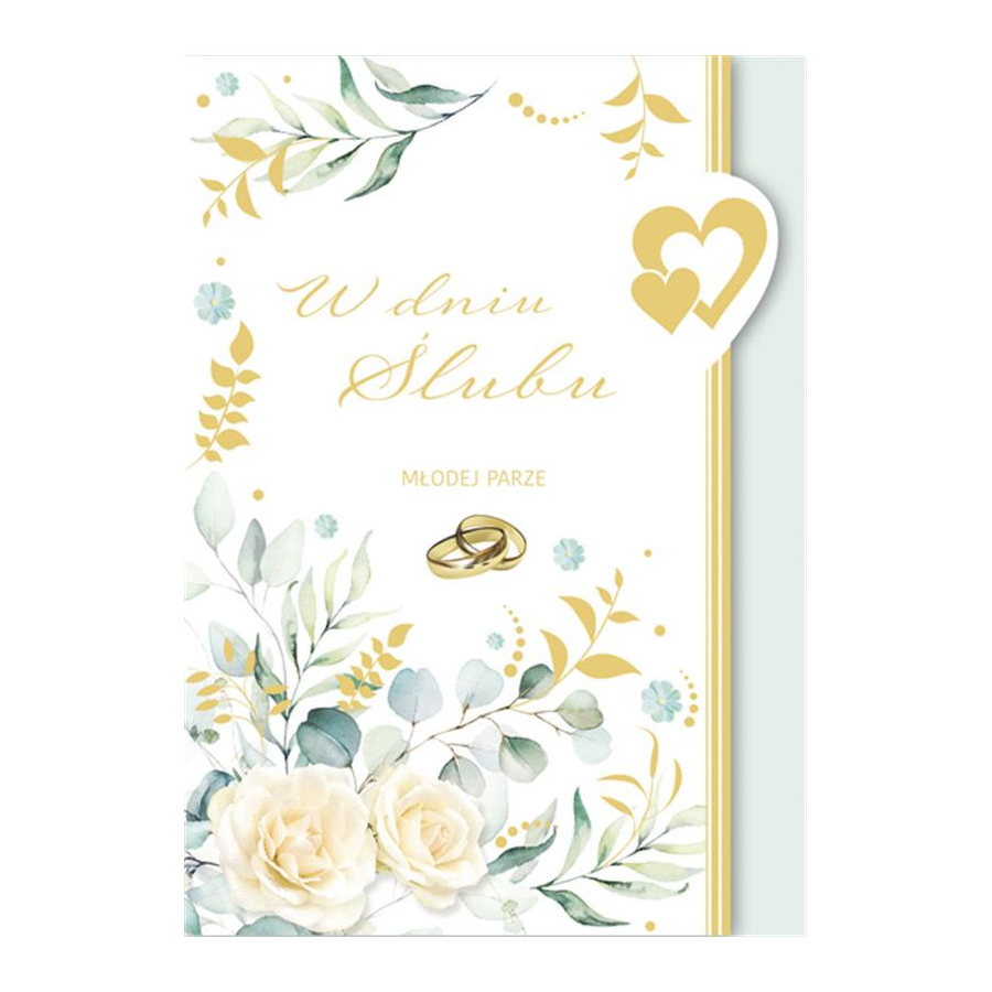 KARTKA ŚLUBNA W DNIU ŚLUBU RÓŻE LISTKI OBRĄCZKI BIAŁA 17x12cm